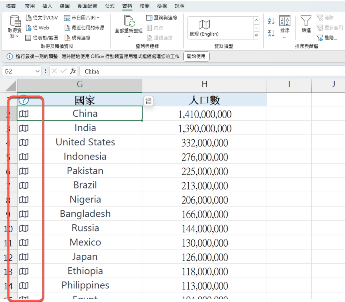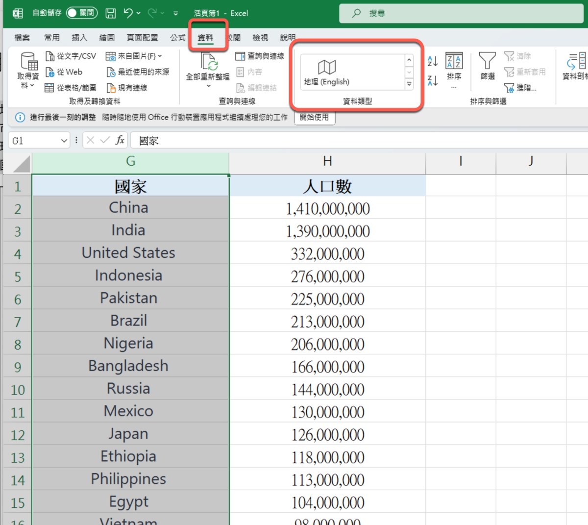 範例檔下載教學:https://steachs.com/officekn/howto.html首先,目前 Excel 支援的區域名稱只有英文,而這地區不一定要用國家,也可以是縣市,而大多弄不出來的原因,就是少做了把地理位置的欄位,要先標記成地理資料才能往下進行,這時可以選取地理位置的欄位後,在「資料」,資料類型中選擇為「地理」,目前 Excel 僅支援英文。