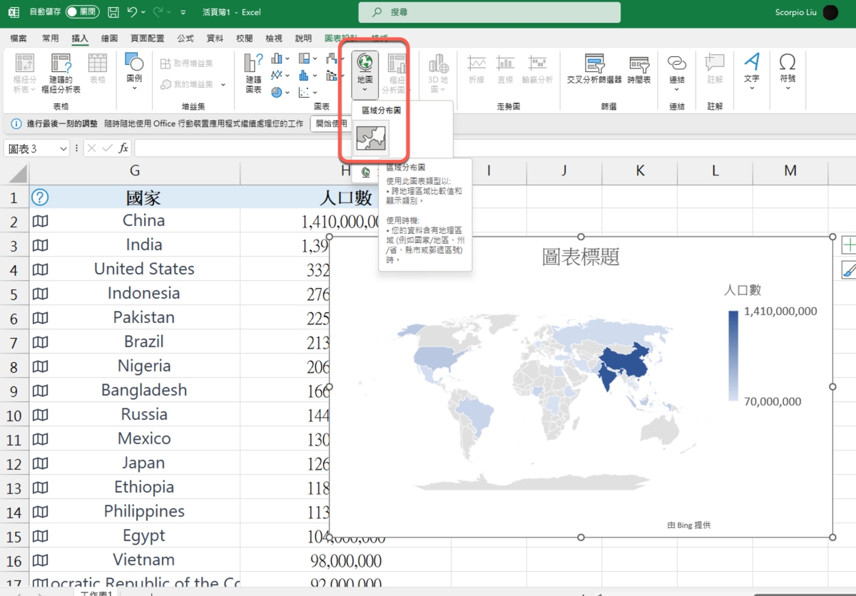 然後選取國家跟人口數後,插入圖表,選擇地圖 > 區域分佈圖,就會在下方顯示一個世界地圖的圖表。