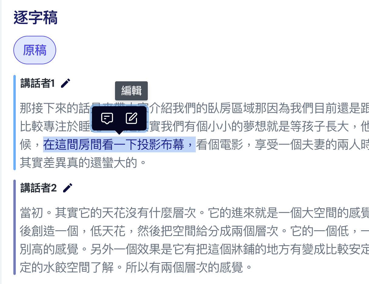 只有主擁有者可以再編輯逐字稿,選擇句子後,會出現評論跟編輯二個功能可以選擇。