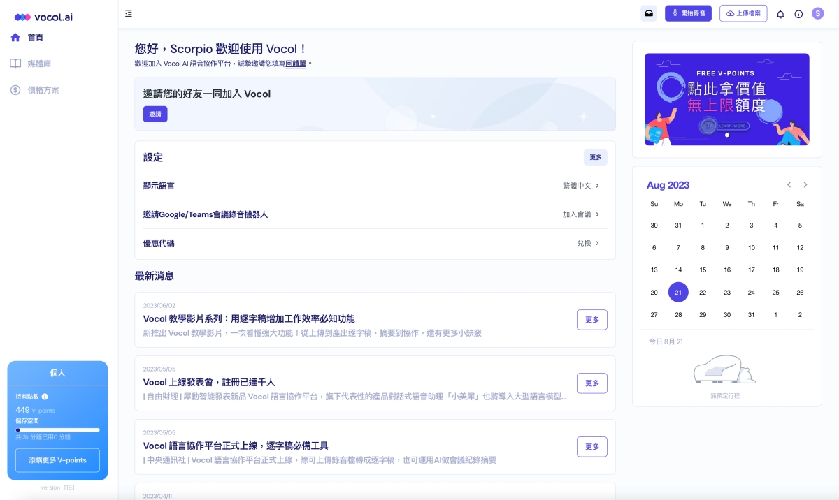 註冊後登入,這後台的介面也超級好上手,左側就是轉換過的媒體庫、方案,右上角可以直接即時錄音或上傳檔案,而中間是相關的設定及更多功能,所有的東西一目瞭然,接下來往下就來跟大家介紹這 Vocol.ai 究竟全部的功能有哪些,以及用起來又如何。