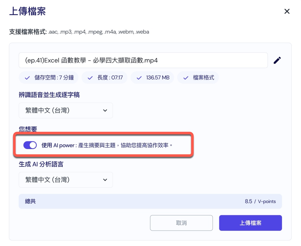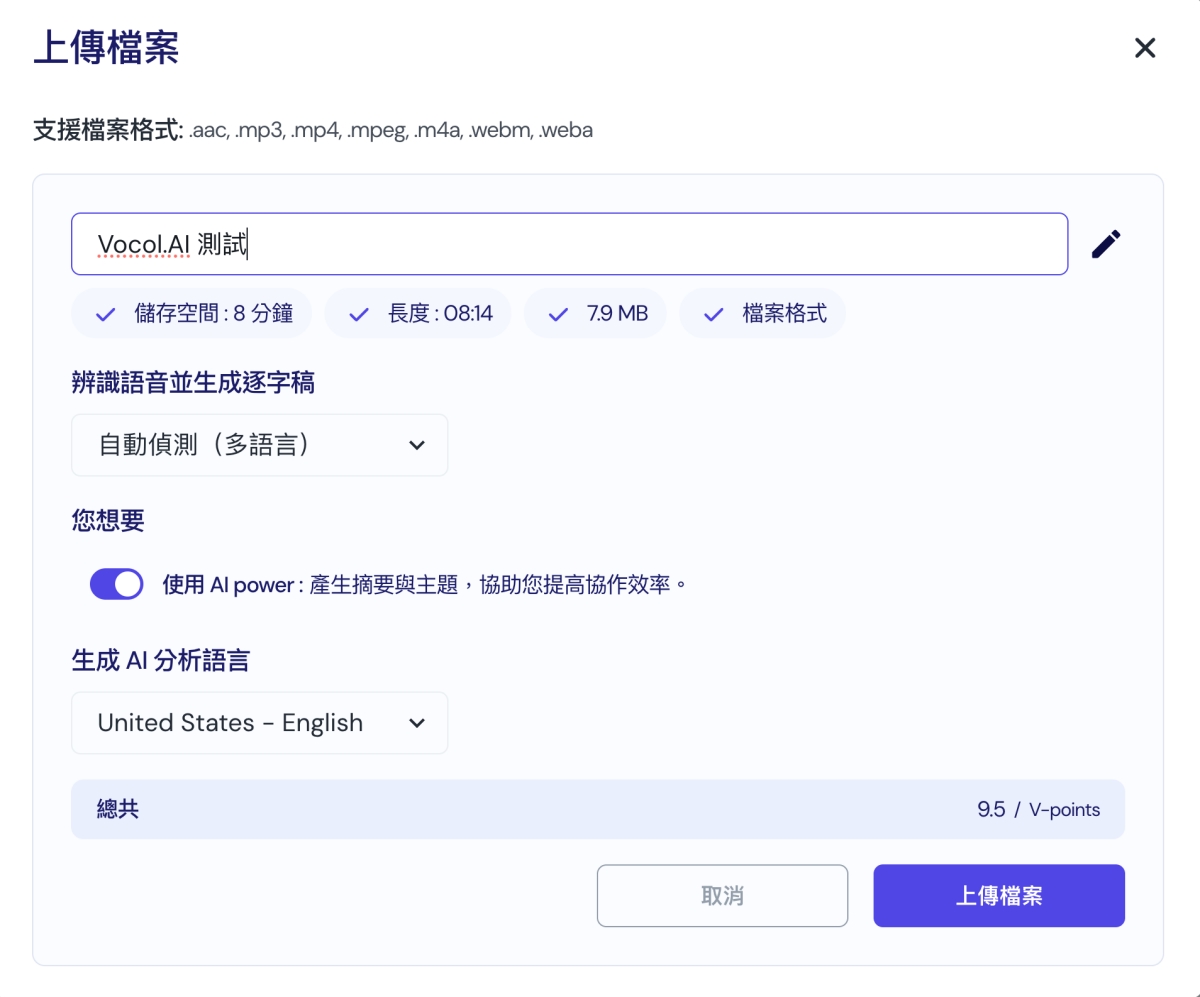 支援的上傳檔案包括:acc,mp3,mp4,mpeg,m4a,webm,weba,不論是常見的或是網路檔案格式都有支援,上傳後只要輸入標籤,選擇要偵測的語言等,就可以進行分析轉換。