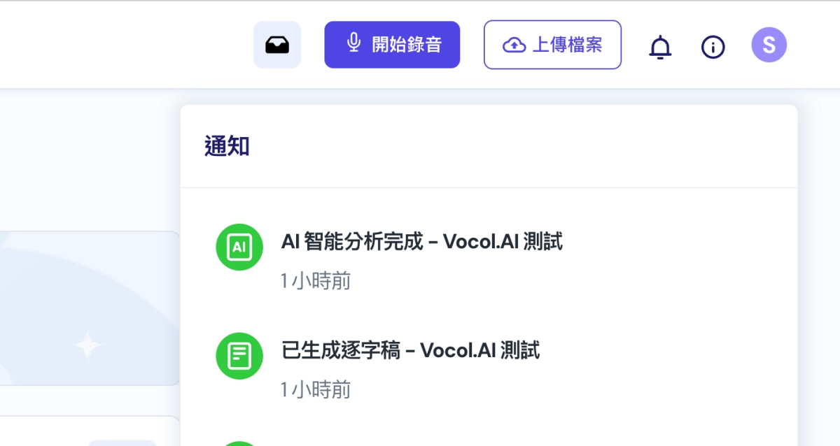 當完成分析時,基本上逐字稿也會在同一時間生成,會在頁面右上角的通知跳出來。