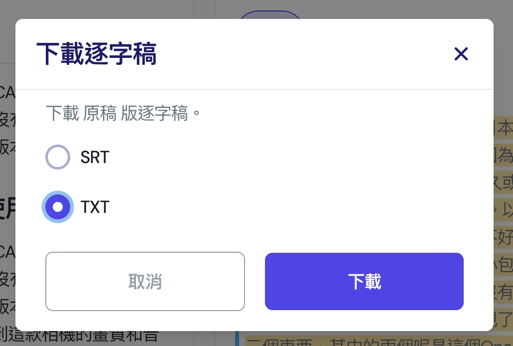 下載逐字稿會有二個格式可以選擇,分別是 SRT 及 TXT,這二個內容也有所不同,如果是選擇 SRT 的話,內容就會是帶有時間軸的字幕檔,如果是 TXT 就真的單純的文字。