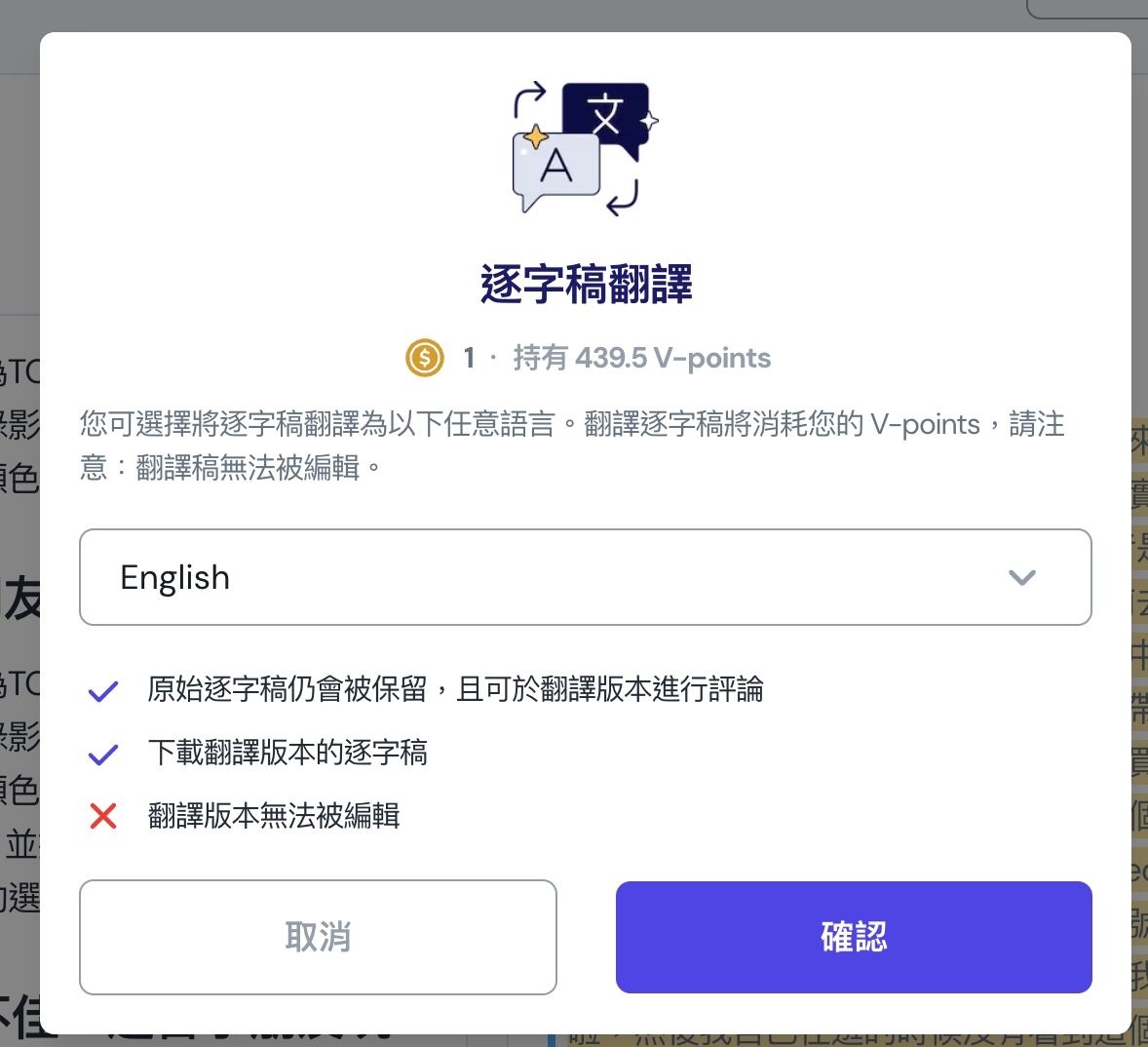 而 Vocol.ai 除了上面那些最基本常見的語音轉文字功能外,接下來要分享幾個我覺得非常實用的功能,首先第一個就是逐字稿翻譯,如果你有多語系的需求,可以透過這功能得到不同的語系字幕檔,同樣的這也是會消耗 V-points,目前內建支援 27 種語言。