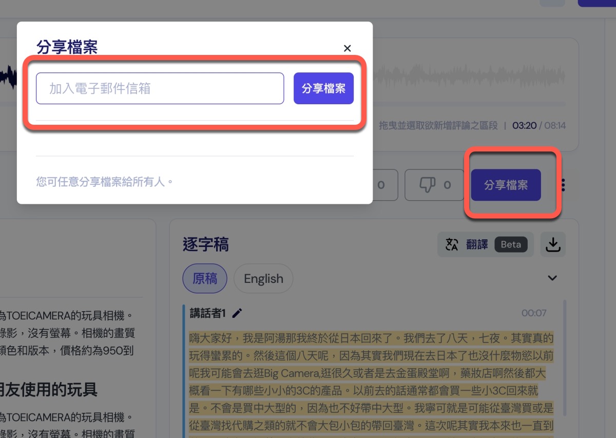 Vocol.ai 的第二個我覺得必須介紹的功能,就是語音協作功能,這項功能就是可以將已處理完的檔案分享給其它人,透過 Email 加入別人的帳號即可。
