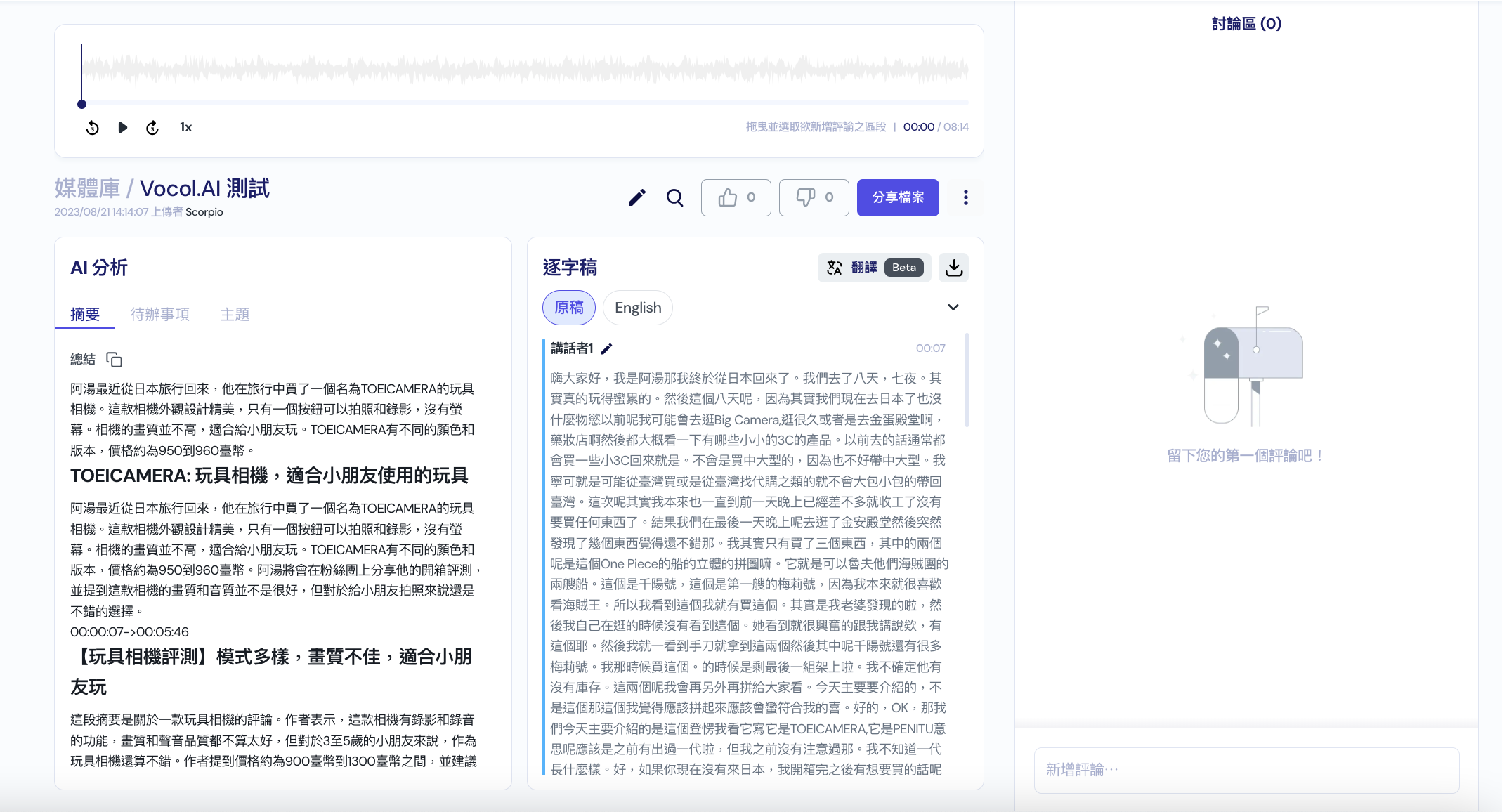 經過 Vocol.ai 的分析後,會將語音的全部內容轉出為二個部份,在媒體庫裡可以查看,左邊主要是 AI 分析,針對你的內容幫你做重點重摘要,並且條列內容整理,我試了各種不同長度的內容後,發現這摘要的重點整理其實蠻準確的,大致上看完摘要就可以了解內容是什麼。
