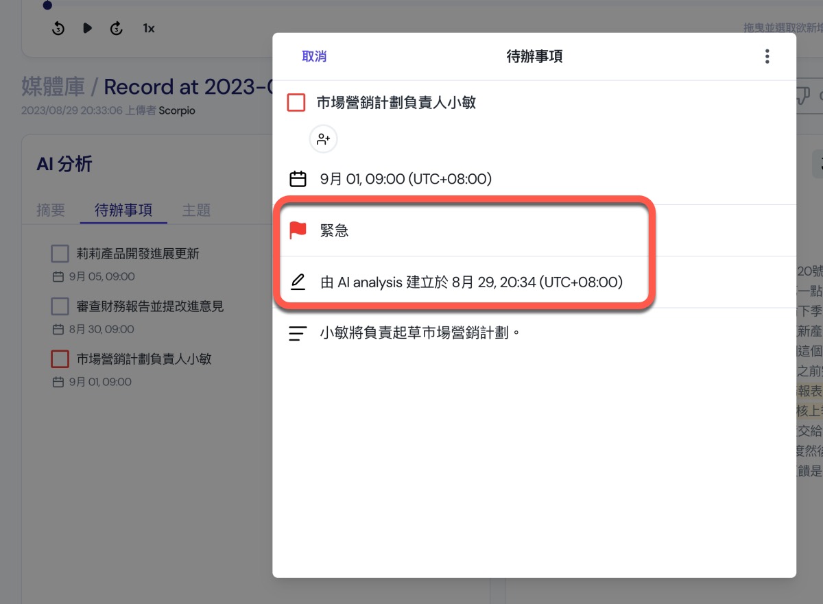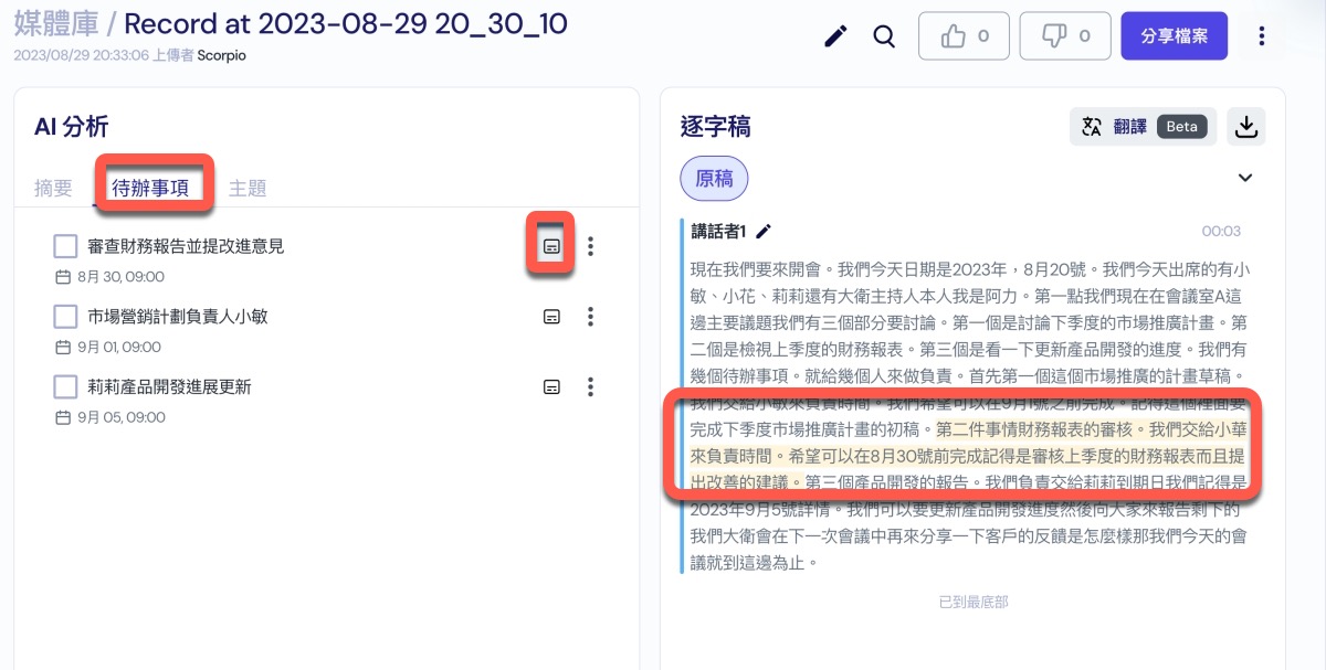 原本的 AI 分析裡,現在多了一個「待辦事項」的功能,只要你的會議內容裡有提及要做的事項以及時間的話,這邊會自動分析挑選出來加到待辦事項裡,如果沒有生成待辦事項,可能是因為音檔是類似介紹產品,或是一般訪談。而且你在這裡點擊後還可以去查看該待辦事項原始的內容是在哪一段,方便比對,不過目前還是要滑動找查一下原始逐字稿,如果重點是要看待辦事項,這功能倒是輔助用的。