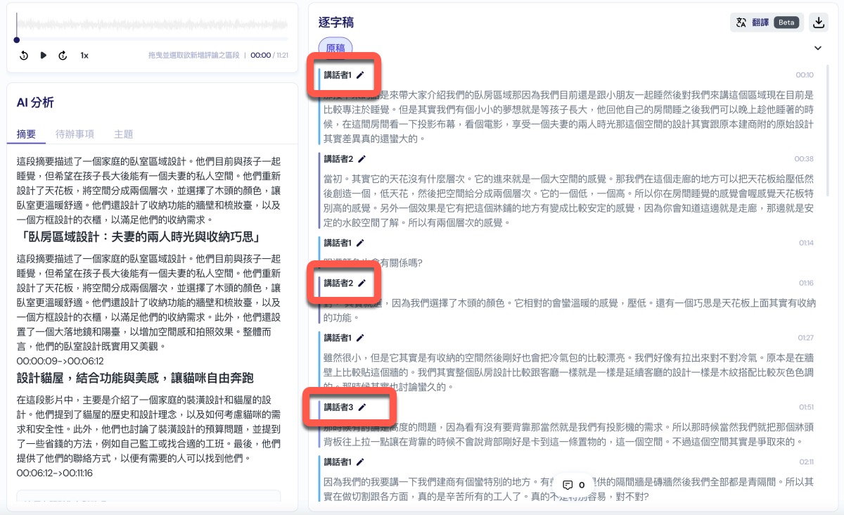 等一會後,就會將會議的內容變成摘要以及完整的逐字稿了,這時只要稍做調整比對,就可以拿去做為正式的會議記錄囉,這真的是超級超級實用。