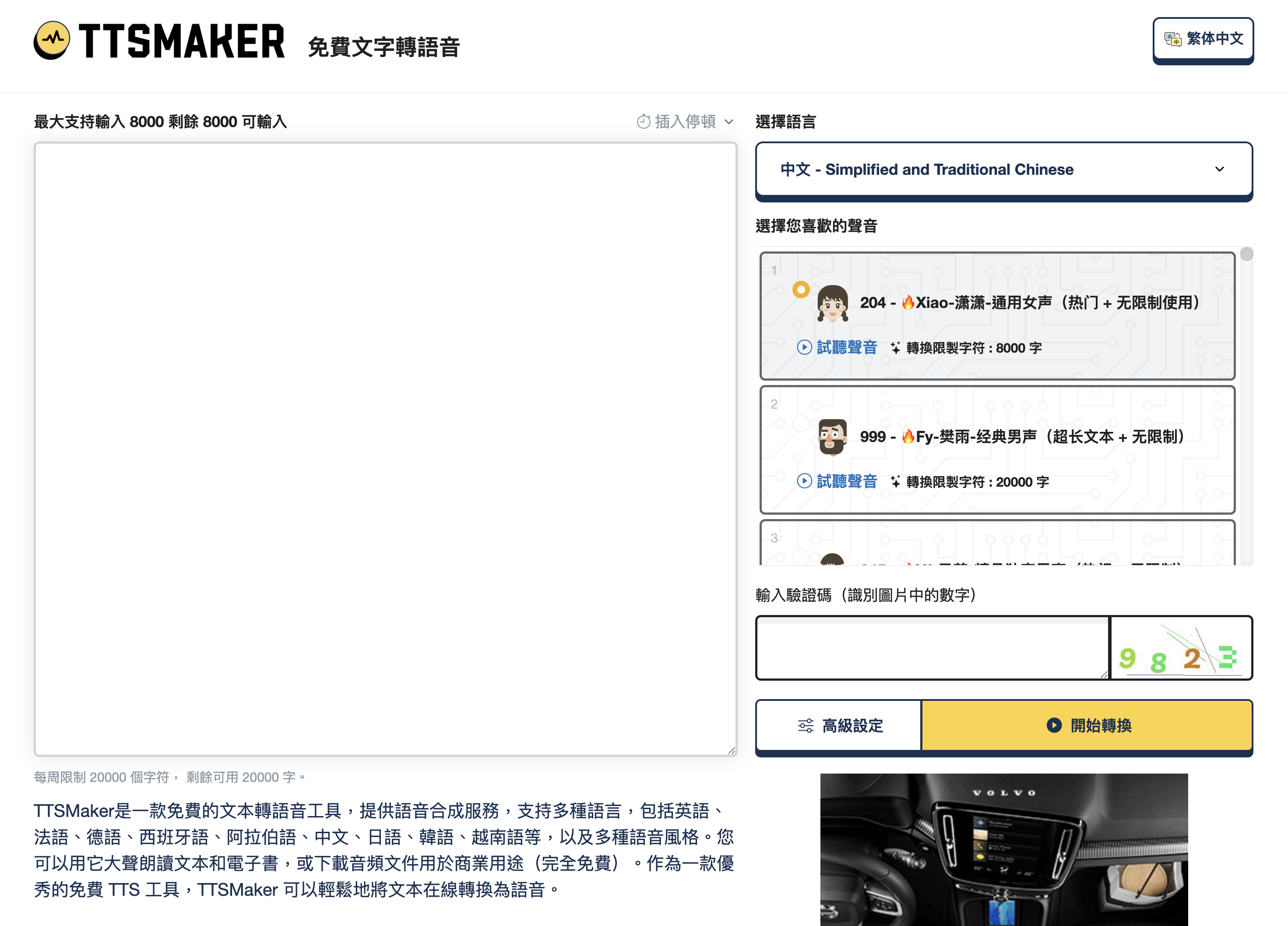 網站:https://ttsmaker.com/zh-hk進入頁面後,這主介面做的我蠻喜歡的,很好看,左邊主要是輸入內容,右側選擇語音,聲音等,就可以進行輸出。