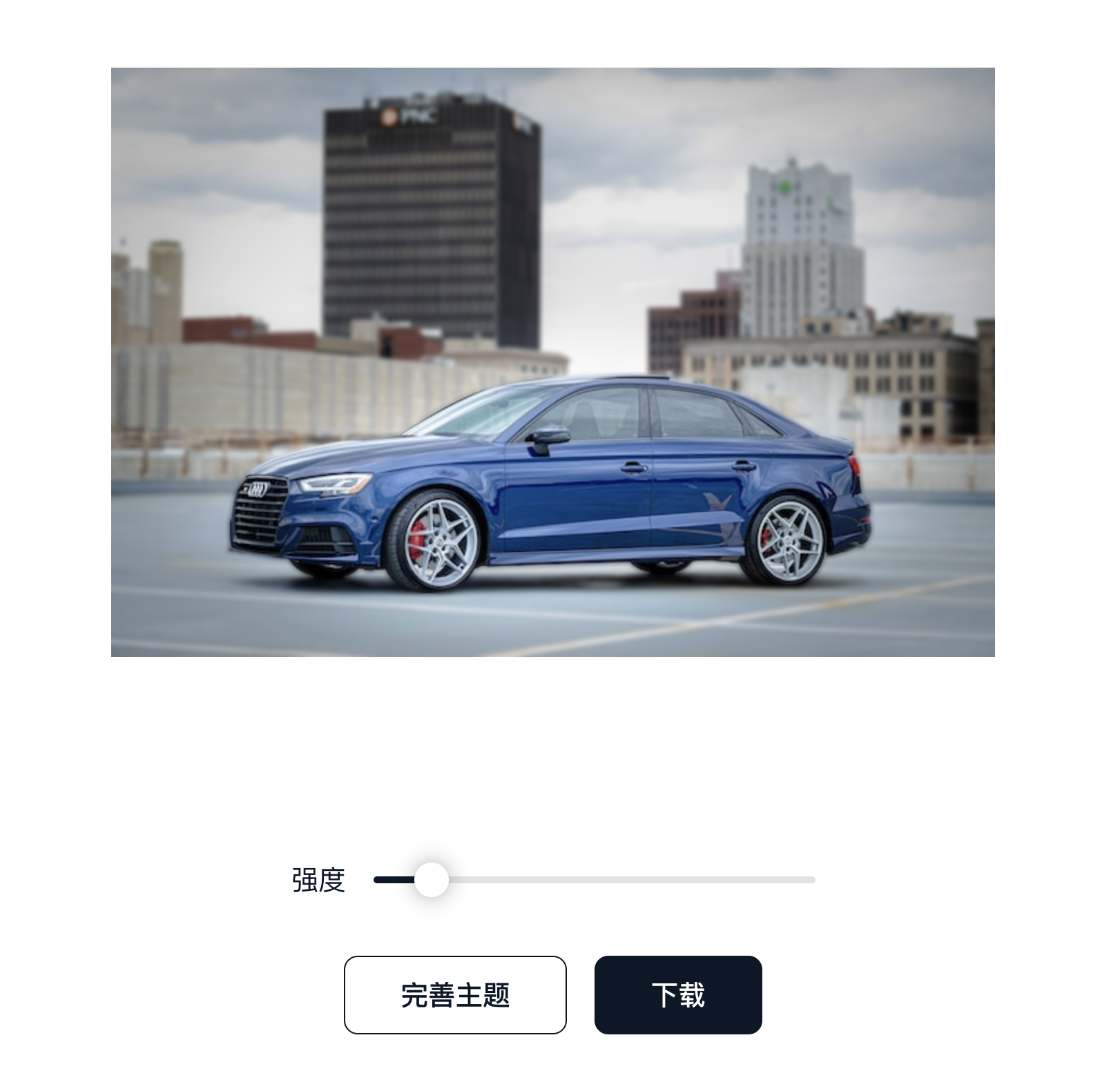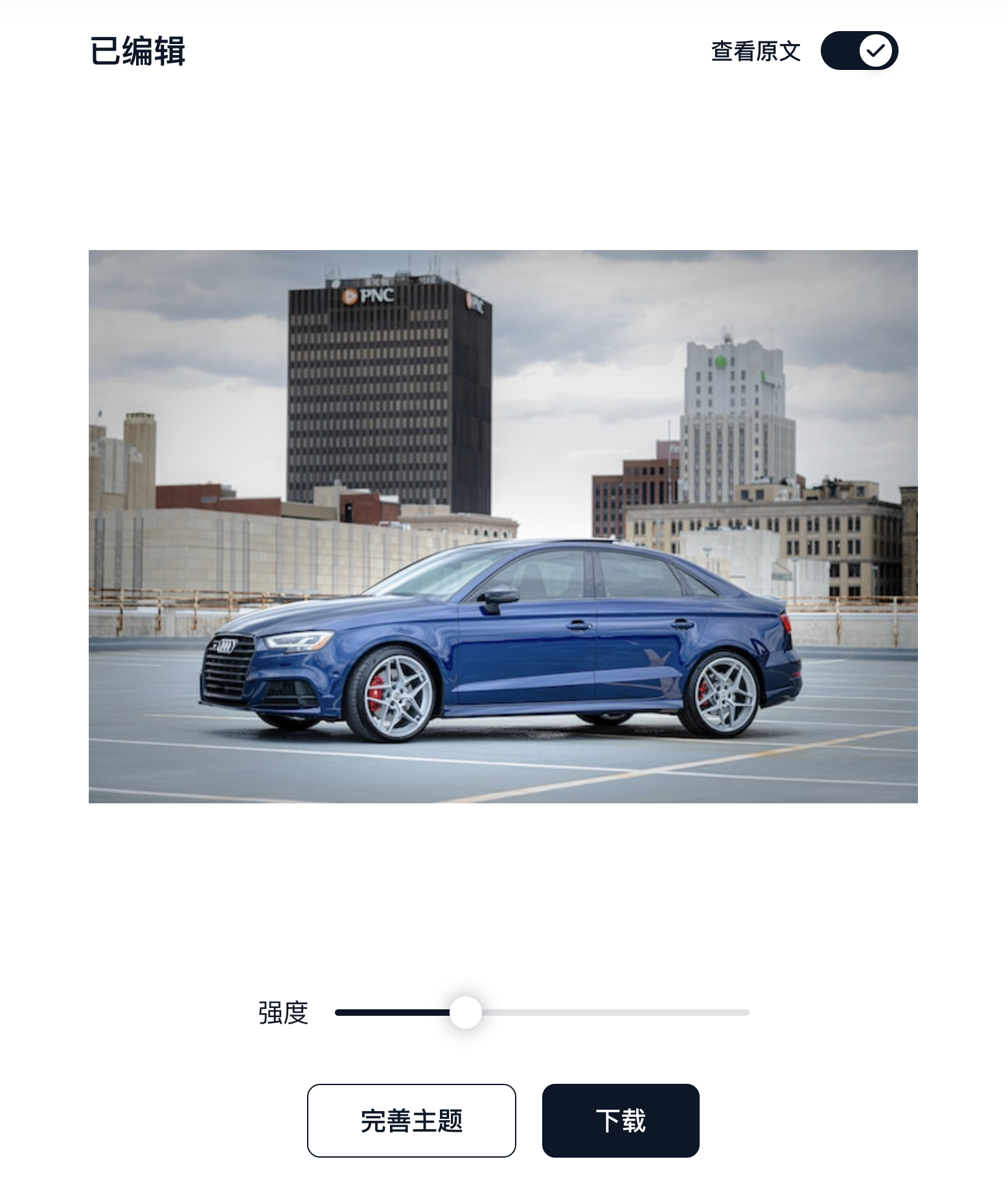 然後大概等個幾秒就會出現完成的照片,不過預設的強度都有點太過頭,你也可以點擊右上角的查看原文,比對一下原本的照片長怎樣。