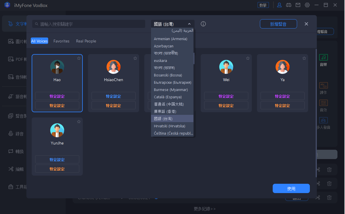 步驟2:選擇「國語(台灣)」或其他任何你想要生成配音的語言類型,再選擇你想使用的聲音效果,有男聲、女聲和其他逼真的音效,選擇完畢後點擊「使用」開始體驗。