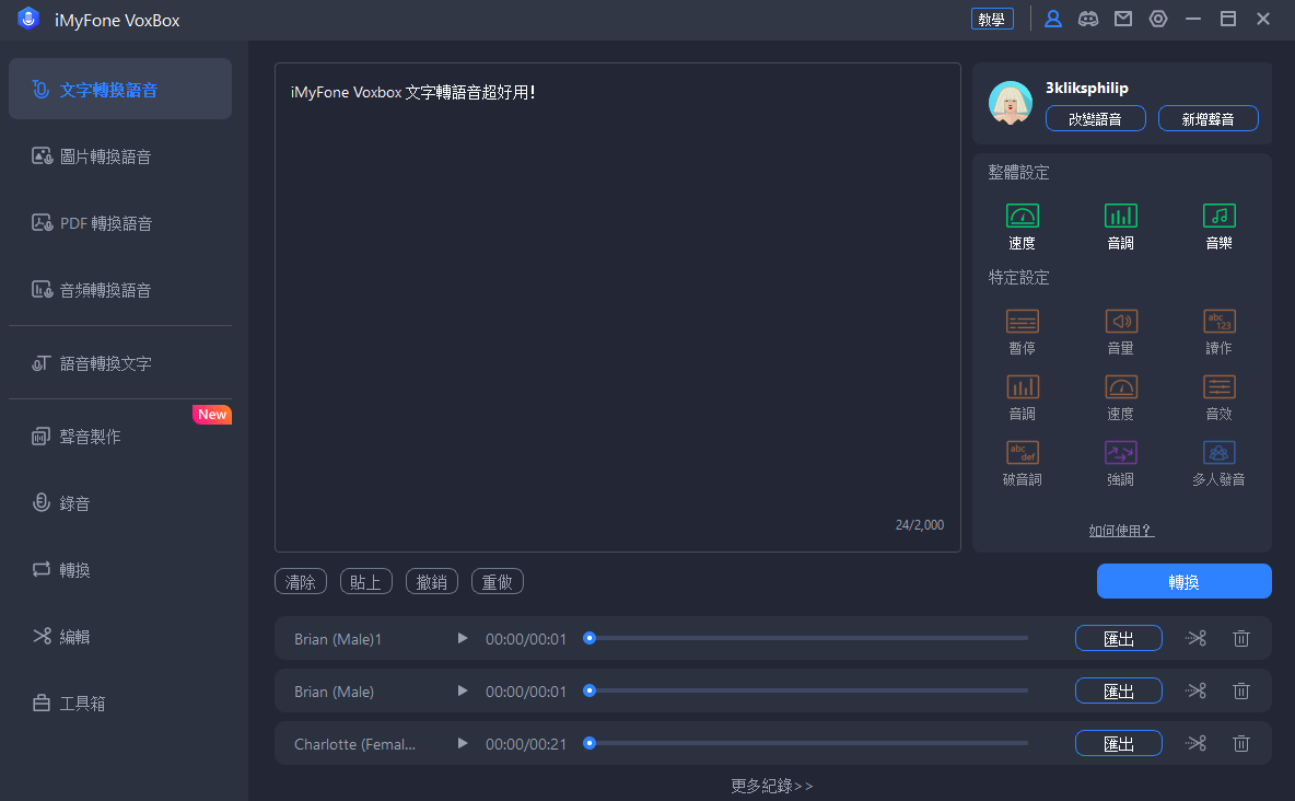 並在文本框內輸入想轉成語音的繁體字,iMyFone Voxbox就會幫你自動生成對應語言的語音了。