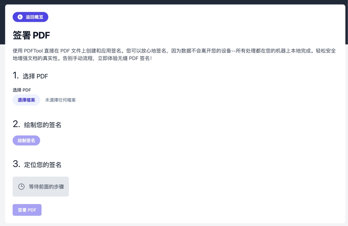 來試一下簽署 PDF 給大家看,我開啟網站後就離線使用了,這時你選擇要使用的 PDF 檔案,它不會上傳到伺服器。