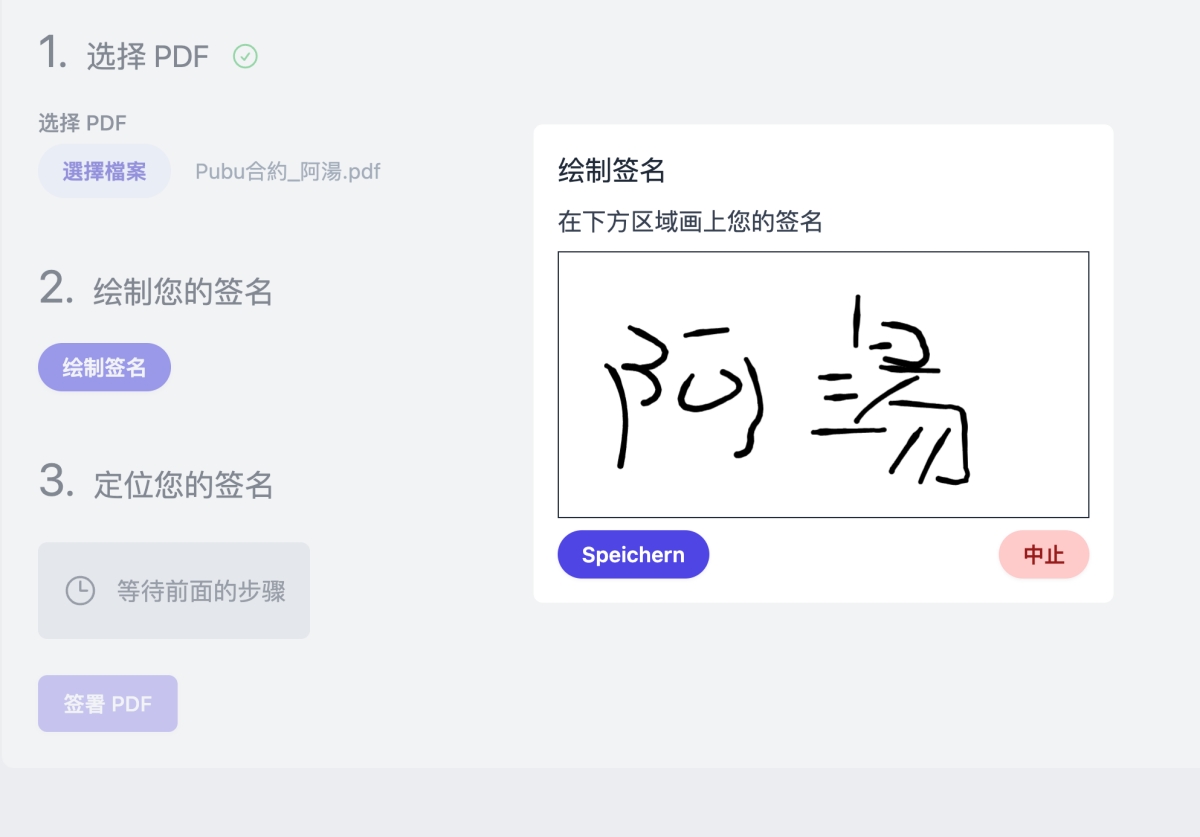 最後按下簽署 PDF,然後就可以將你的簽名檔加到 PDF 的任意位置,調整完後,沒問題直接點擊簽署 PDF 就會將完成的檔案直接下載囉,超方便,而且沒有隱私問題。