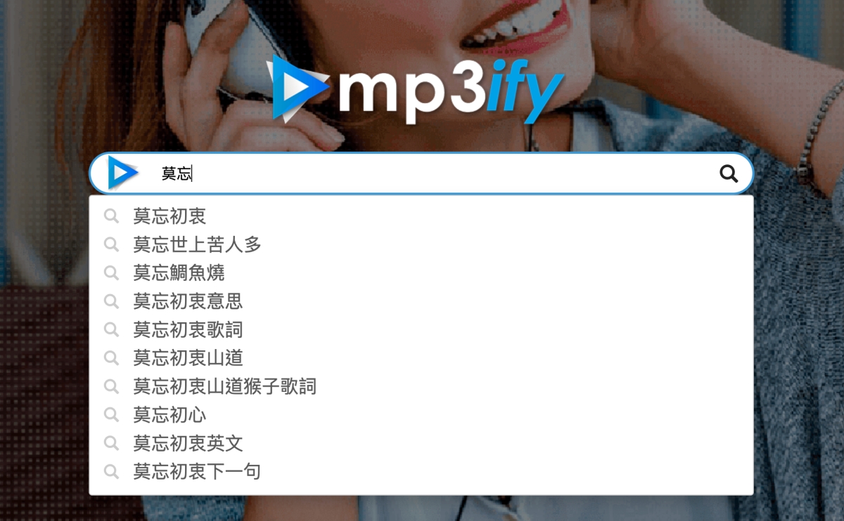 網站:https://www.mp3ify.com/進入網站後,直接就可以在搜尋框找想要的音樂,直接輸歌曲名稱搜尋,而且這網站沒有廣告。