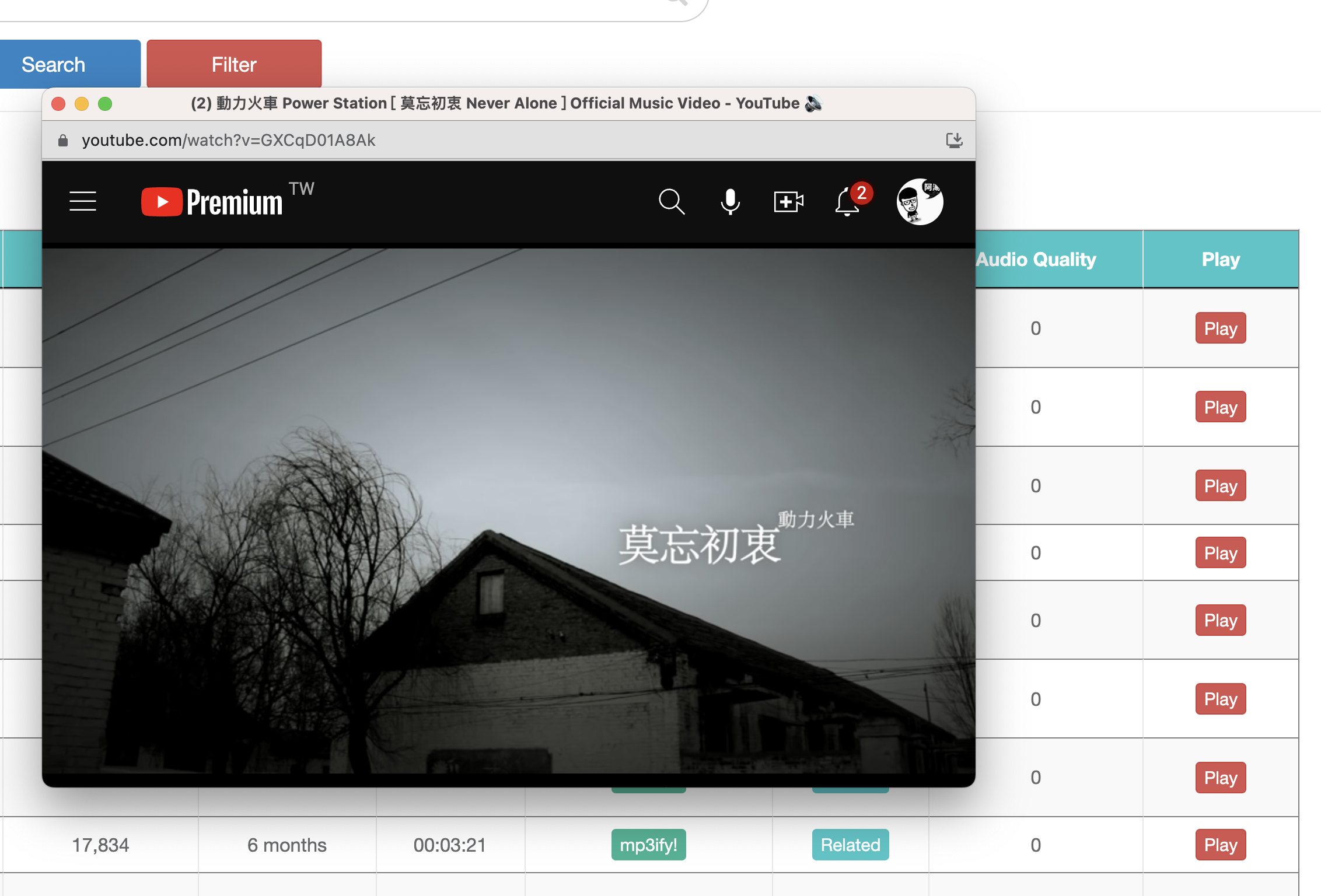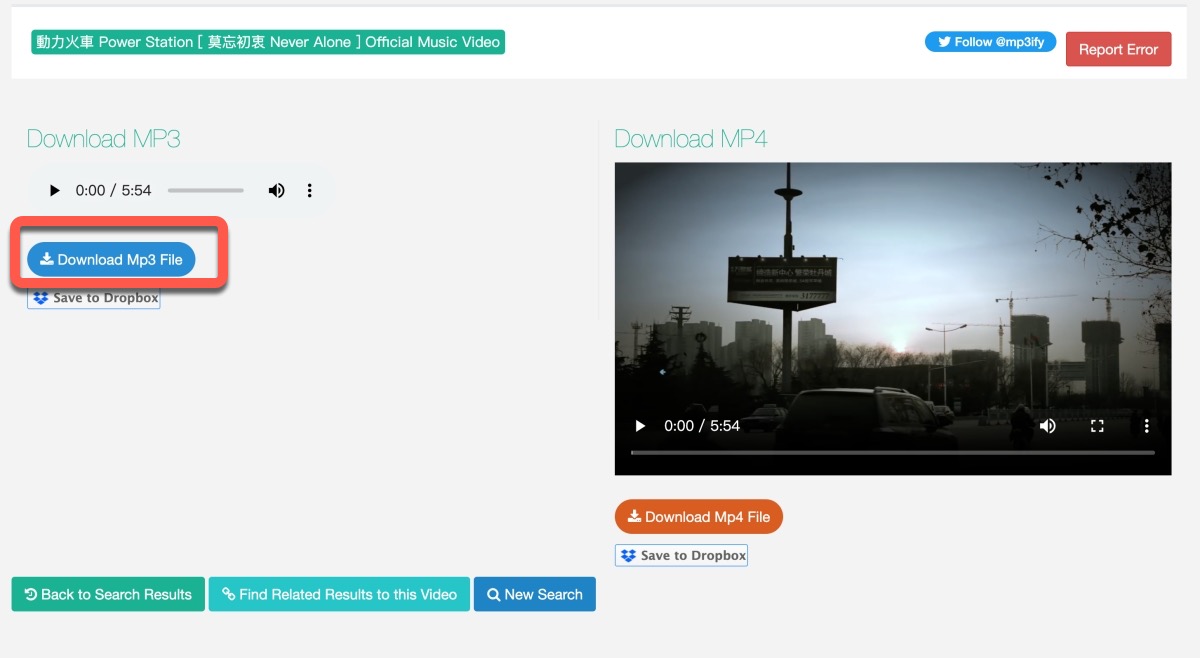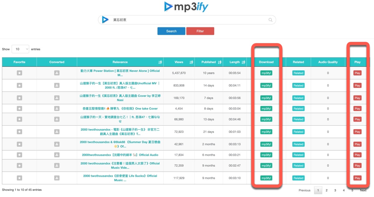 搜尋出來後、下方會列出所有這名稱相關的 YouTube 內容,這時你可以選擇 Download 或是 Play,如果點擊 mp3ify 進行下載,點了之後要稍微等一下,大概 10 秒左右。