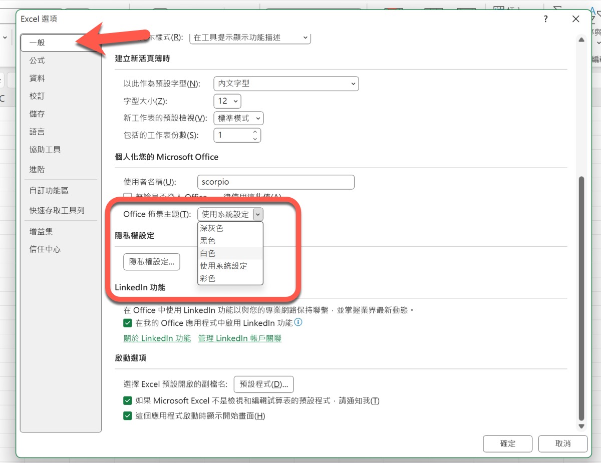在一般裡往下拉,就會找到 office 佈景主題,這裡修改會一併調整 Word、PPT 的主題,預設為彩色,也就是大家印象中的綠藍橘三色,你也可以單一主題色,比如深灰、黑色、白色或是用系統設定。