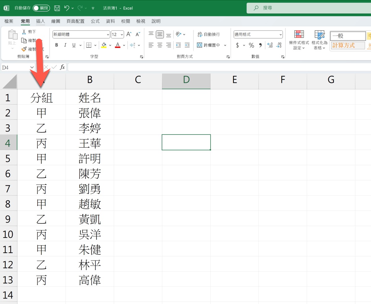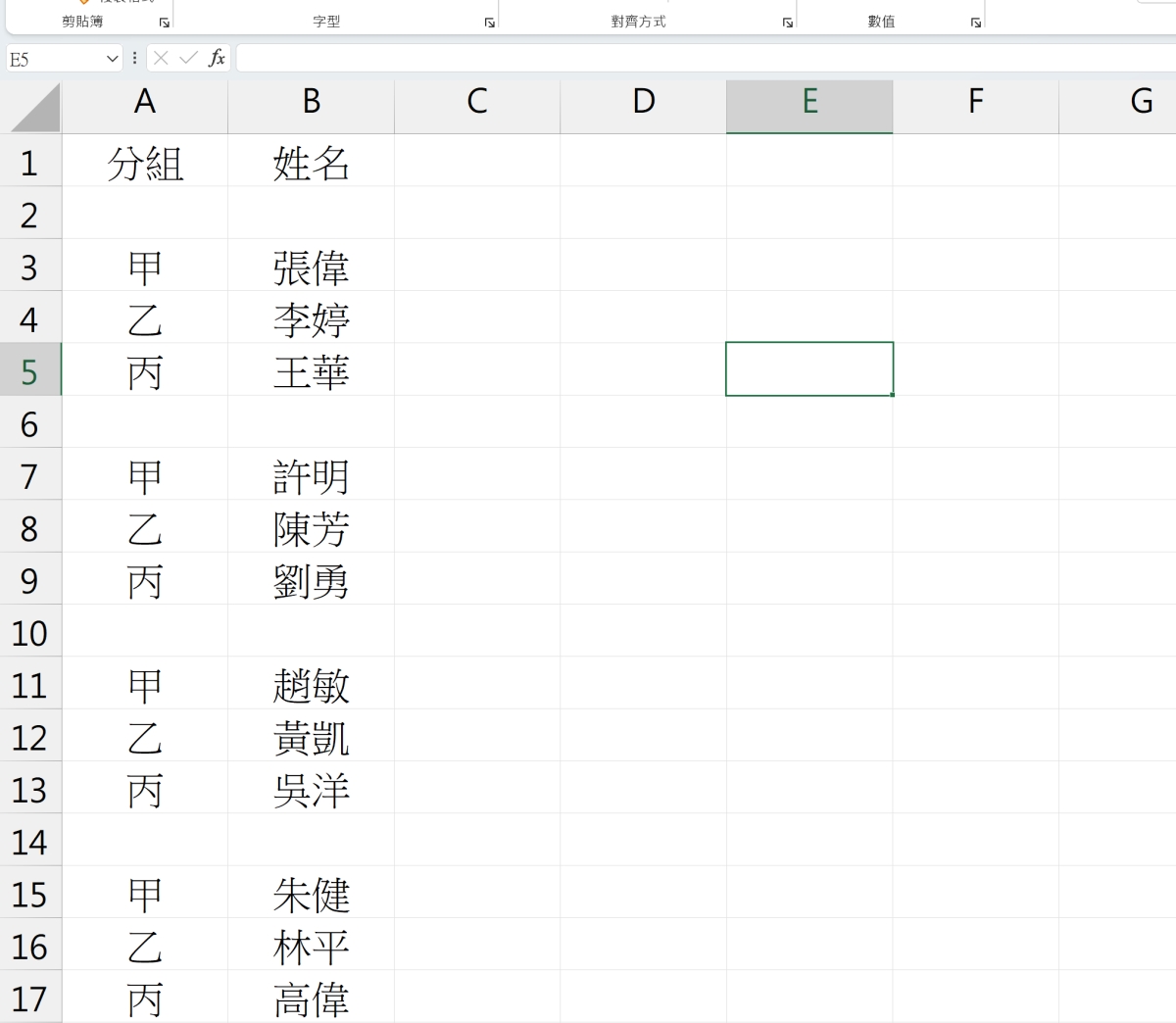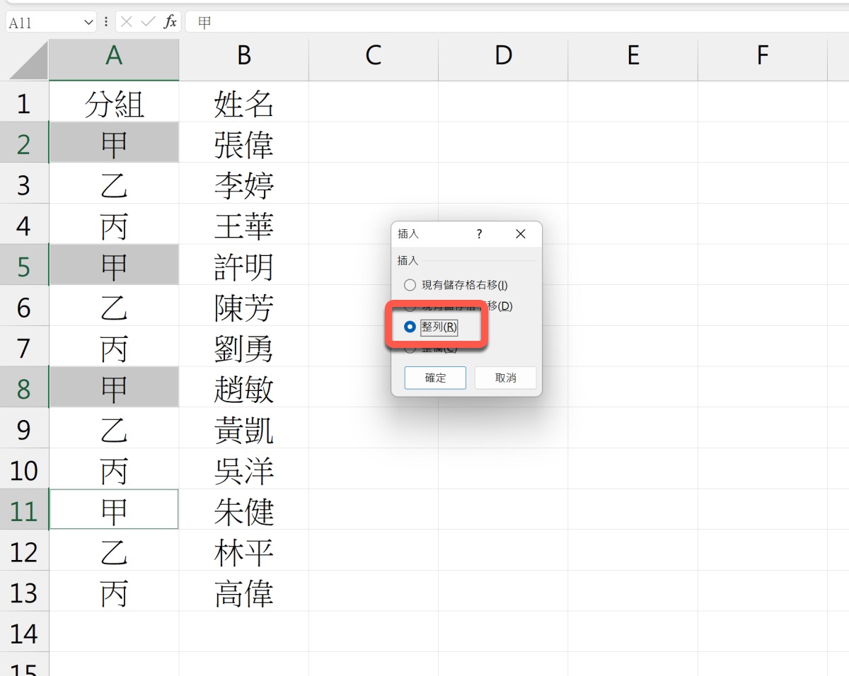 首先資料概念大概是這樣,就是分組已經用甲乙丙的方式一直往下,他們想要每個甲乙丙都加入一行空行來隔開。