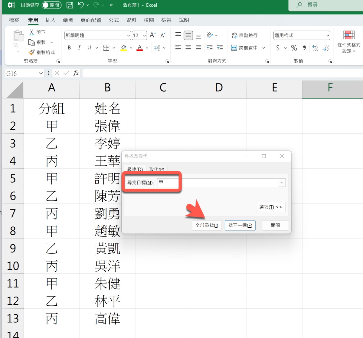 首先,先全選整個 A 行,然後按下 Ctrl + F 進入尋找功能,內容輸入「甲」,也就是每個要隔開的地方,按下全部尋找。