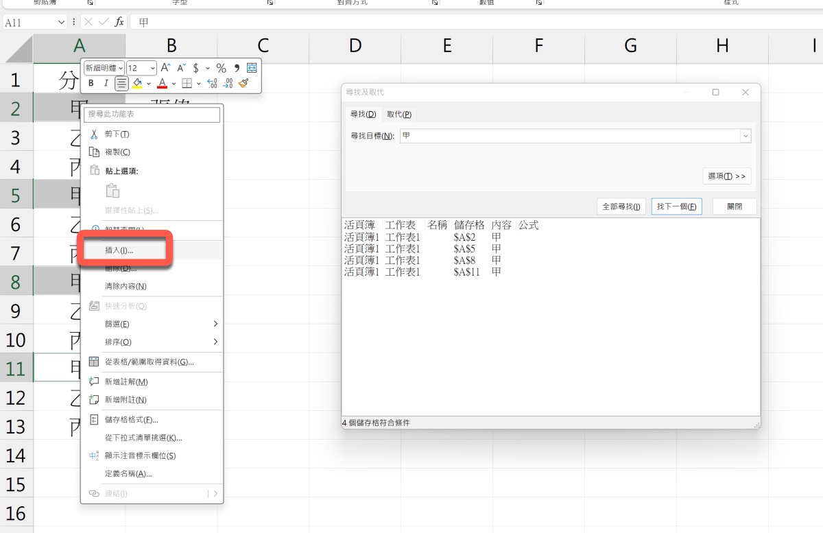然後在左邊被選中的任一個「甲」右鍵,點擊「插入」。