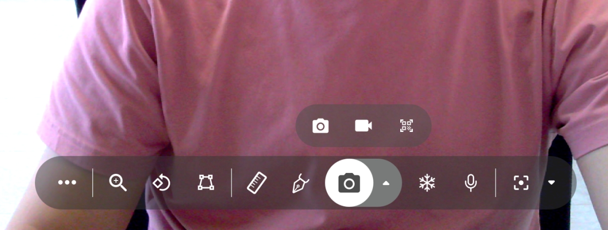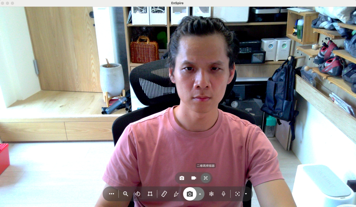 透過 EnSpire 拍攝,包括拍照、錄影以 QR Code 掃描功能,在主按鈕右側為凍結畫面(定格)、麥克風控制以及對焦相關設定,往左則是註記功能、尺規、梯形修正、旋轉及放大。