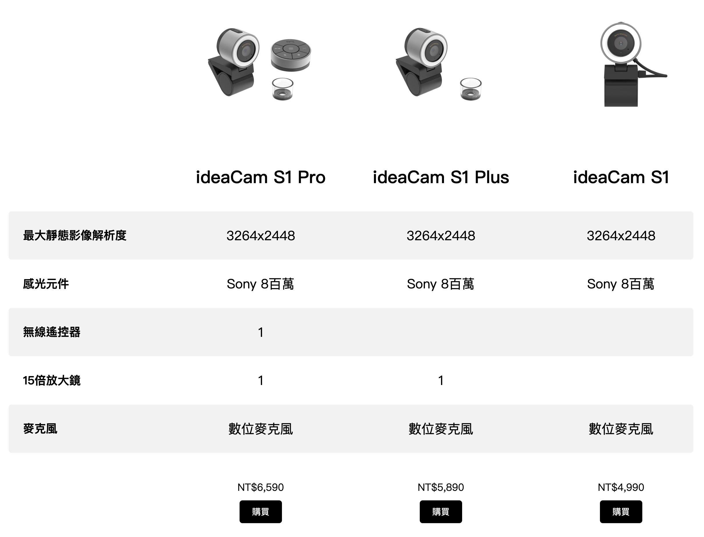 ideaCam S1 系列一共有三個型號,分別是 ideaCam S1 Pro、ideaCam S1 Plus 還有 ideaCam S1,自推出以來受到很多人的喜愛,不論是用於視訊會議、拍攝物品都非常的方便,而這三款型號,在主鏡頭的部份規格都是一樣的,都是支援近 4K 的最大靜態影像解析度 3264x2448 並採用 Sony 8 百萬感光元件,差別在配件的部份,S1 Plus 多了 15 倍放大鏡(微距),S1 Pro 則是除了 15 倍放大鏡外再多一個無線遙控器,依據需求自行選擇不同的搭配。