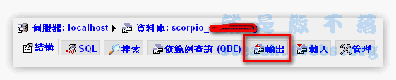 所以站長在前言說到了,除了善用工具,還要善用方法哦,需要大量取代的時候,就可以利用到資料庫的部份,那要如何取代呢?進入PHPMyAdmin後,選擇你的資料庫點選輸出