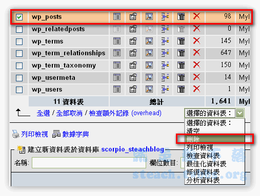 接下來將原本的posts資料表勾選,刪除,準備匯入修改後的資料表