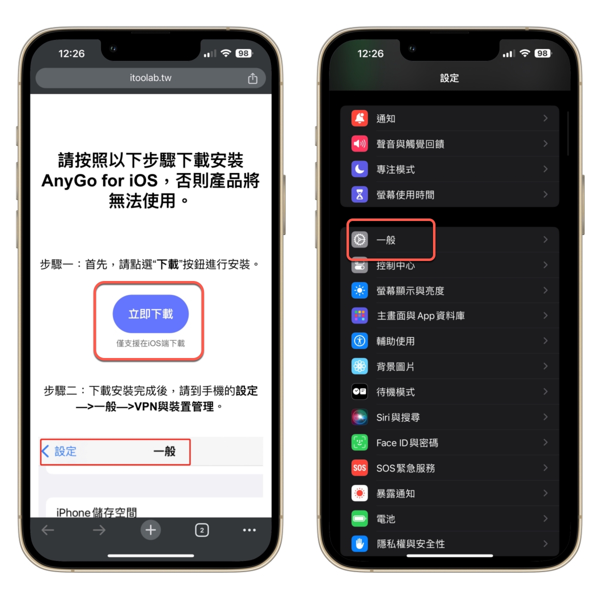 如果你想要在外面不透過電腦也能自由移動的話,可以使用 iPhone 的 App 來達成。iToolab AnyGo for iOS:https://itoolab.tw/iphone-location-changer-app/先用 iPhone 點擊上面連結後進到安裝畫面,先點擊立即下載,安裝後,進到「設定」>「一般」。
