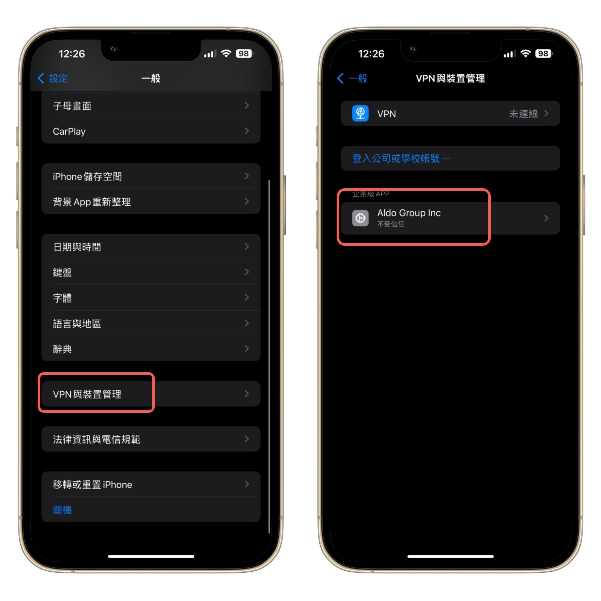 「VPN 與裝置管理」然後找到 Aldo Group Inc 點擊進去。