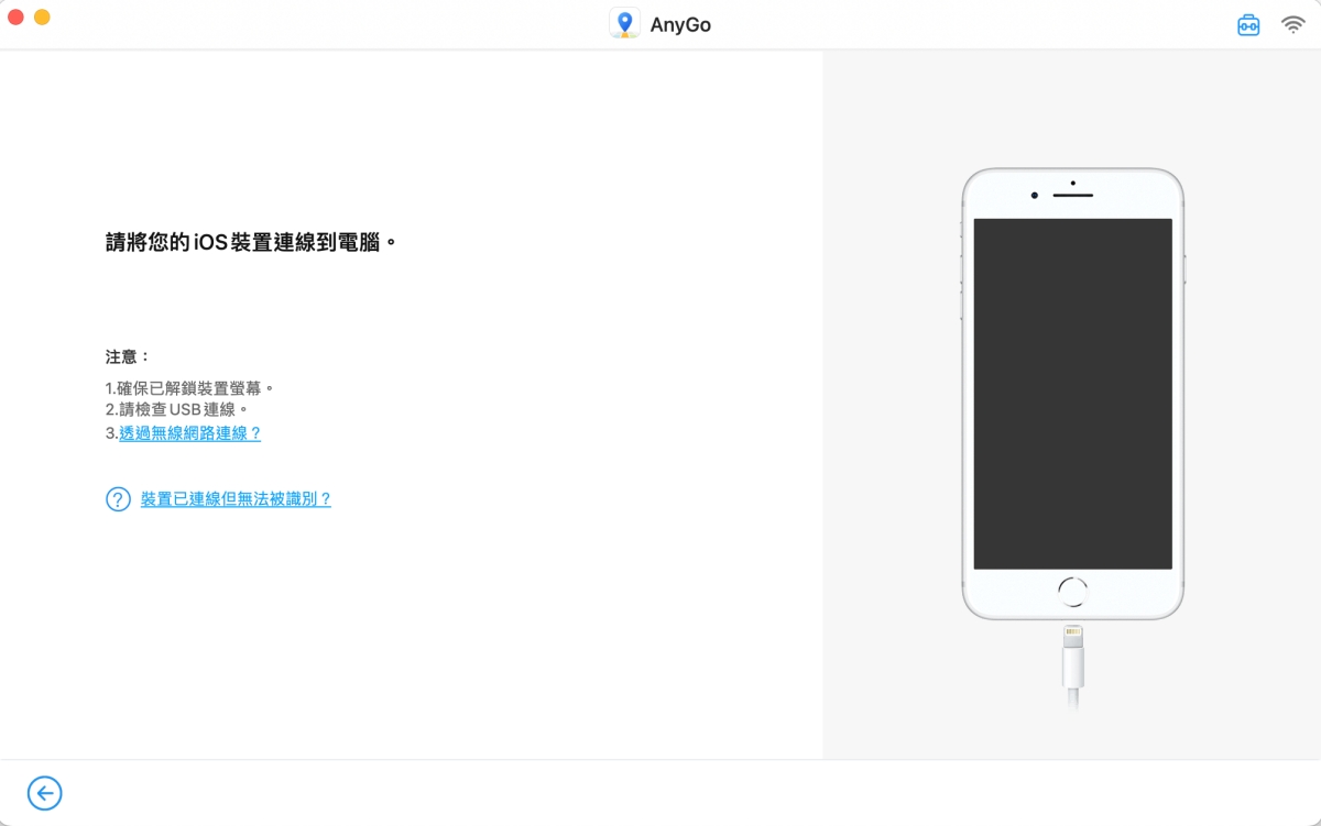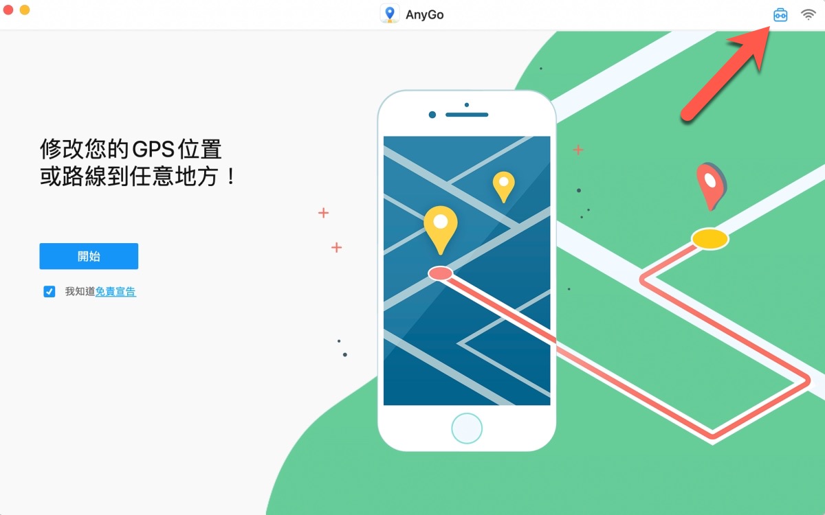 手機端完成安裝後,我們還需要透過電腦版的 AnyGo 來做點設定,主要是用到右上角的工具包,如果你完全沒有要使用電腦版 AnyGo 來操作的話,可以不用購買金鑰,只要買 iPhone 版的金鑰就好,使用工具包沒有影響。