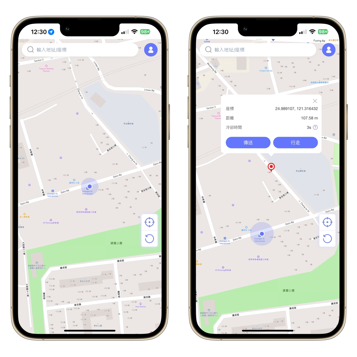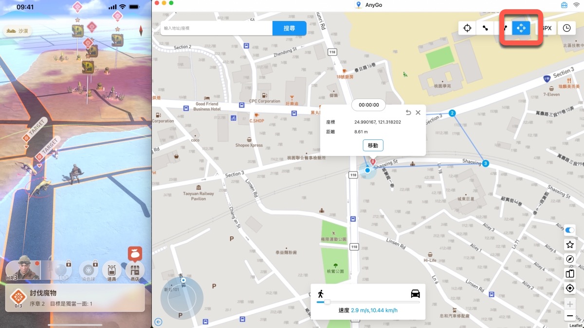 手機版的 AnyGo 功能沒有電腦版來的豐富,但絕對夠用了,基本上還是能夠自由定位,模擬行走,這麼一來即便你在外面吃飯,也能坐在餐桌前玩魔物獵人囉。