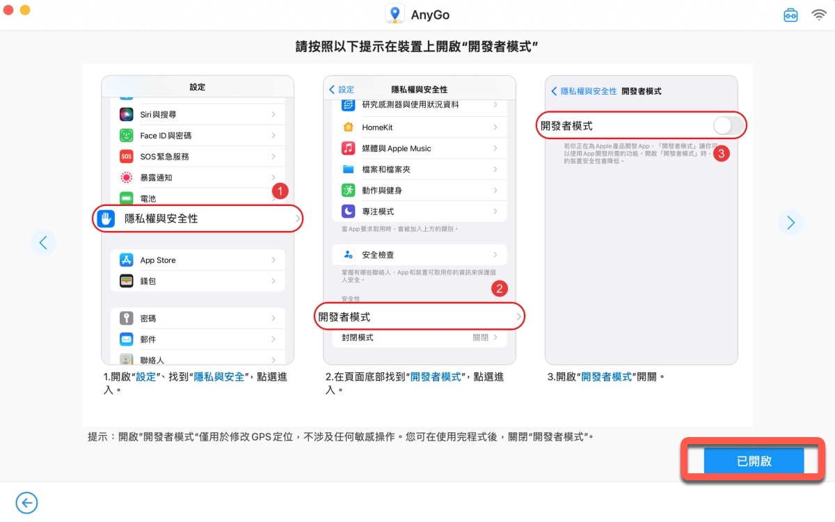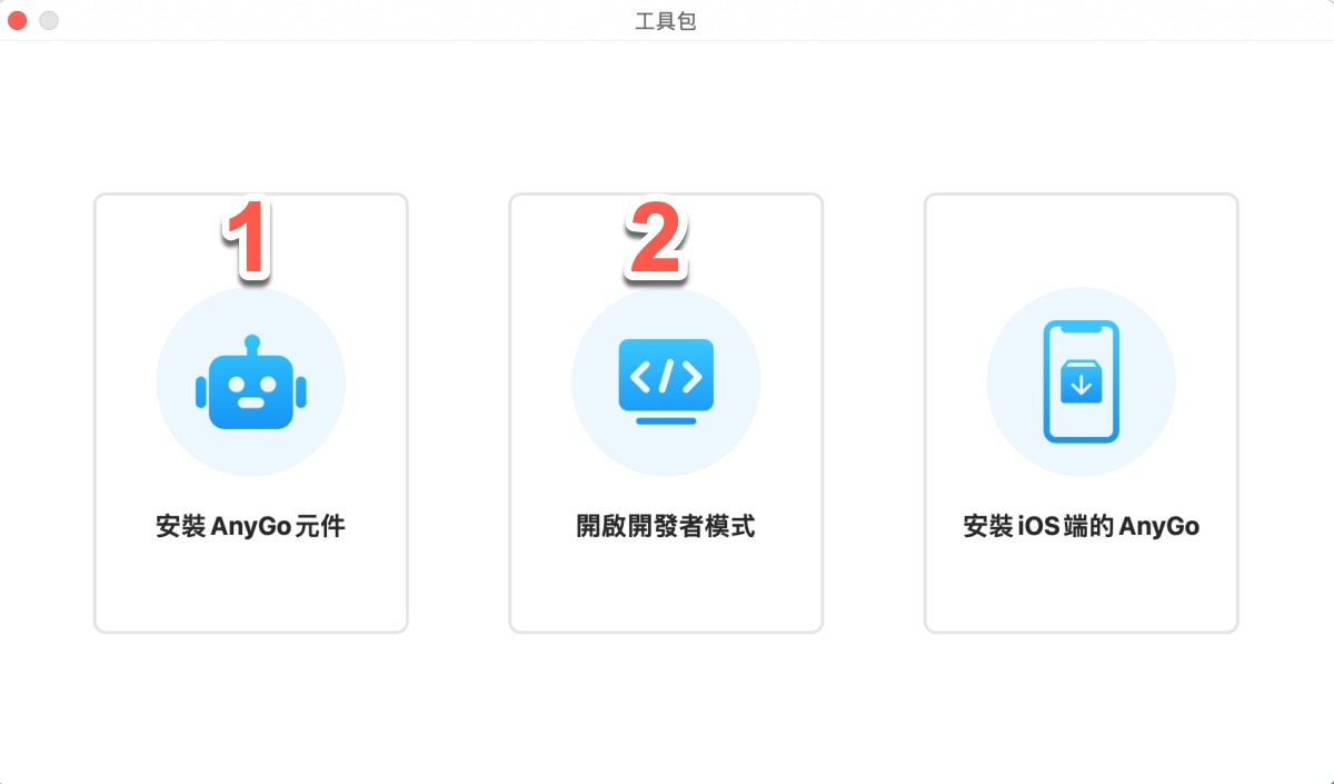 然後先使用工具包第一個「安裝 AnyGo 元件」後再點擊第二個「開啟開發者模式」,一個都完成後就正式與電腦無關了,可以單獨去開啟手機上 App 來使用。