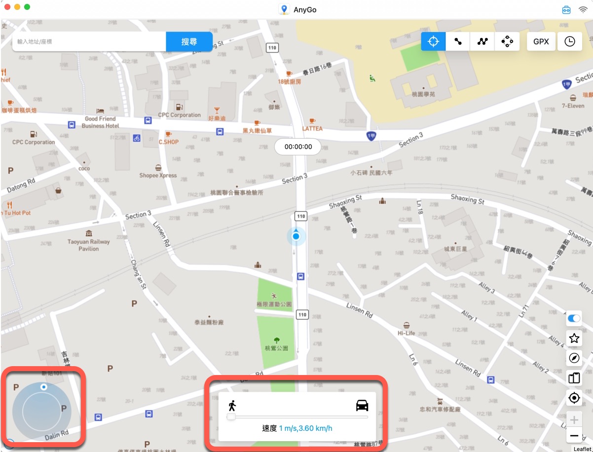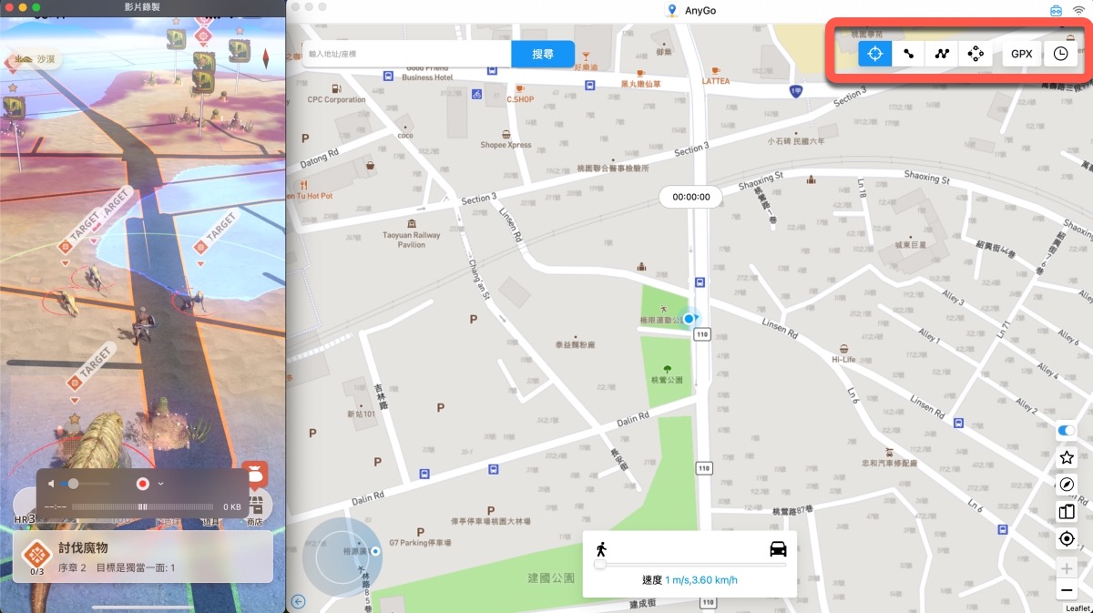 接下來只要重新連線就可以進到 AnyGo 的主畫面囉,使用非常簡單,首先如果你是想要完全手動移動,在最左下角有搖桿可以使用,你也可以直接使用鍵盤上的上下左右來操控,而中間下方可以調整走路的速度,一般來說人的走路速度大約是落在 3~6km/h,建議像魔物獵人飛人這類的外掛,都不要設定大於 6km/h 以上,比較像是真人的走路。