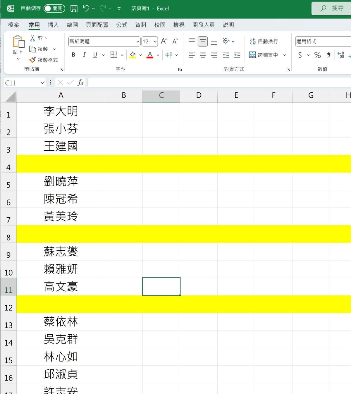 給大家看一下,我用黃色隔開,大概就像這樣的需求,每隔幾行空一行,今天教的方式適用於任何數量的空行。 其它我之前寫過的還有下面這些,都是跟「空行」有關的,大家也可以看看。