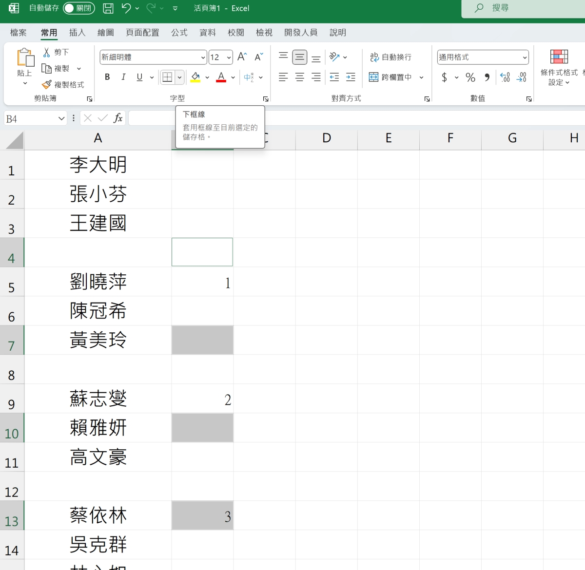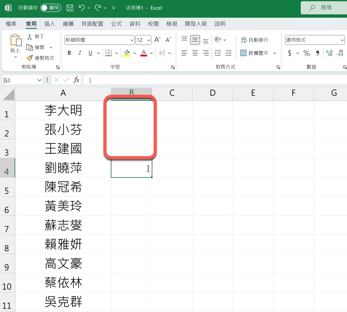 首先,我們以每三行空一行為例,先在要空行的資料旁,如果要每三行,那麼第一區就空掉三格後輸入 1。