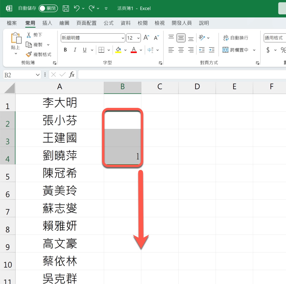 接下來從 1 開始往上選取二格(也就是共三格),如果你是要每四行,那就是往上多選三格,然後往下拖曳欄位延伸。