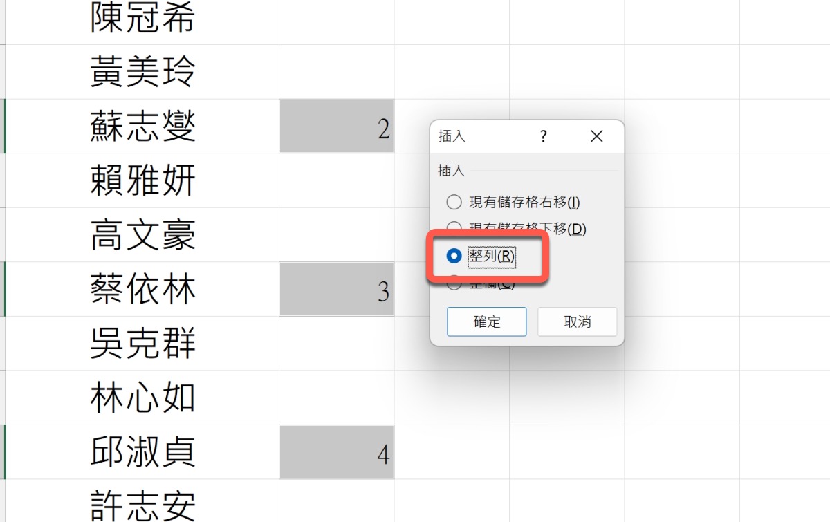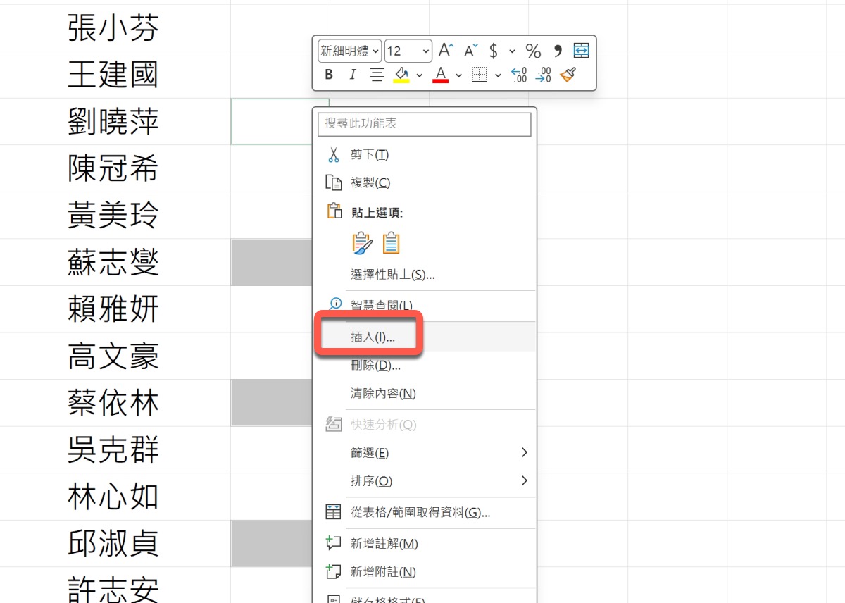 選取後不要按其它地方,直接在任一選中的位置右鍵「插入」。