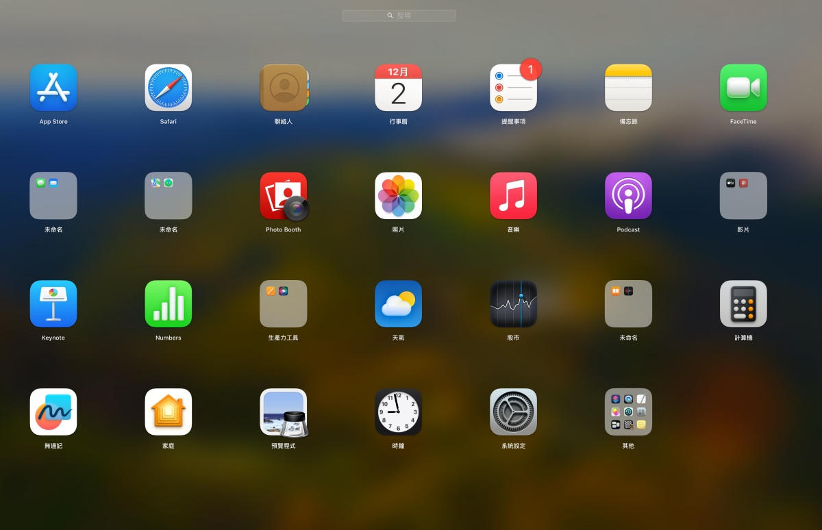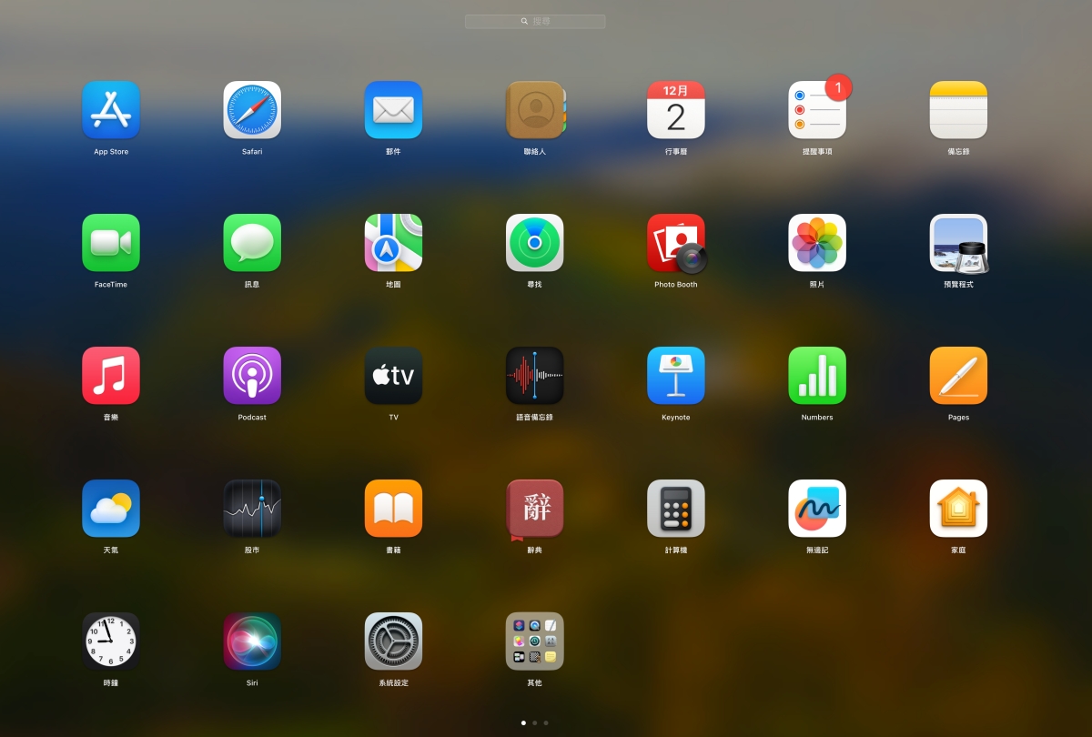 首先,這是 LaunchPad 預設的排列樣子,系統應用程式都在第一頁,第二頁開始才是自己安裝的相關應用程式。
