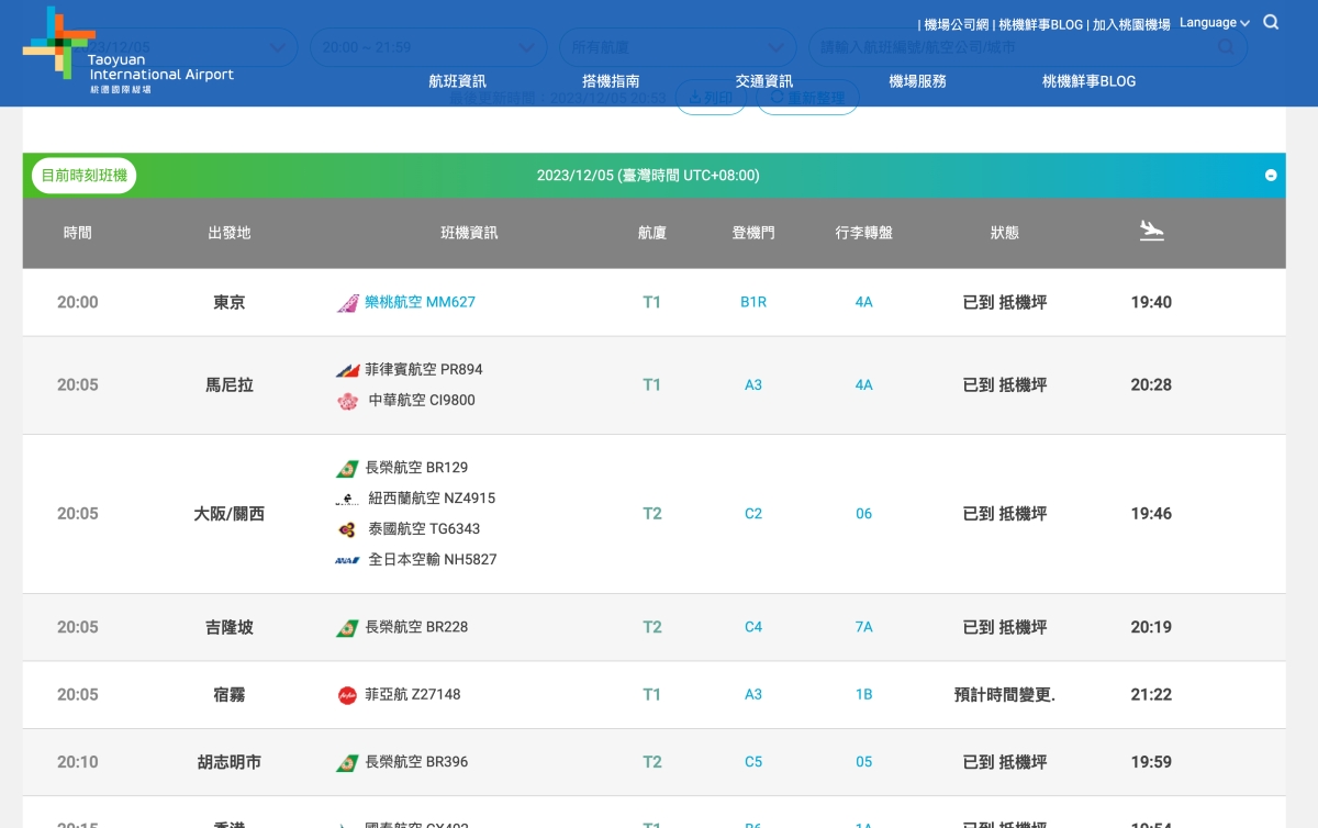 班機時刻表:https://www.taoyuan-airport.com/flight_arrival