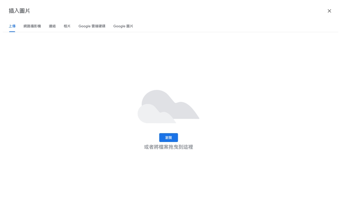 接下來就可以自行上傳圖片,或是從連結,Google相片或 Google 雲端硬碟等方式,還能直接從 Google 圖片裡搜尋來使用。