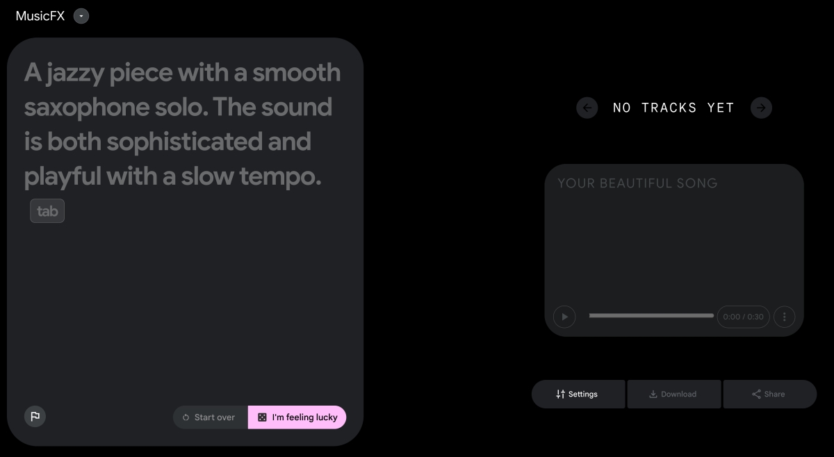 AI 的時代裡,從文案、找答案、教學到產出圖片、影片,現在連音樂也能 AI 產出了,Google 在 AI Test Kitchen 裡推出了一個新的服務叫 MusicFX,簡單的說,就是像 AI 圖片一樣,只要下一些指令就能幫你產出內容,當你看到 MusicFX 這字應該不難理解,這次的服務就是用來產出音樂的,透過指令下完後,可以產出 30 秒的音樂,輸出時可以選擇 50 或 70 秒,目前還是免費的,大家可以試看看。