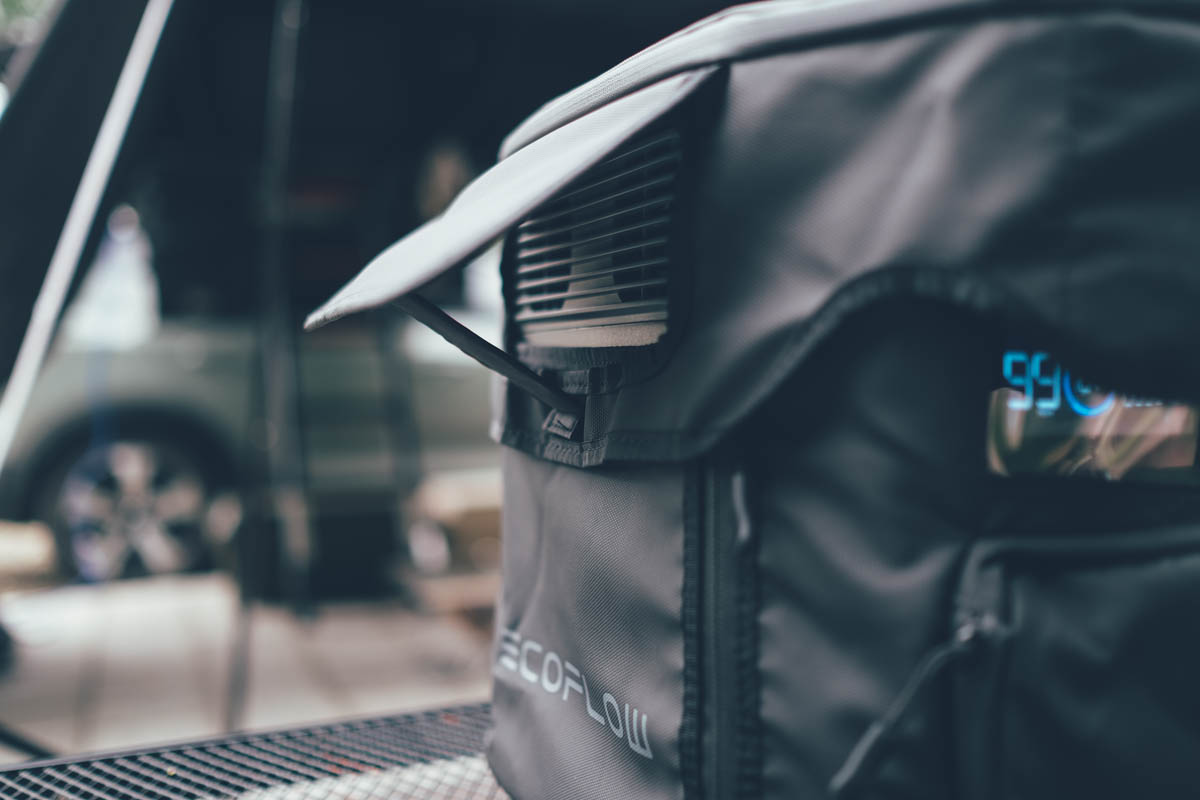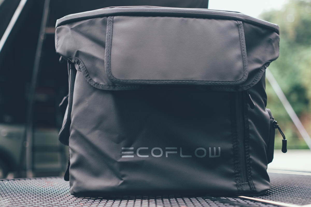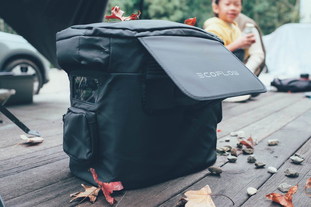 要將這數位時尚科技帶到戶外的話,不能就這樣帶出去用,再來我要介紹一個很棒的配件 EcoFlow DELTA 2 防水專用包,我之前帶行動儲能電源時,都很怕放外面遇到下雨,特別是半夜,有時睡前還得把電池收進車內,而 DELTA 2 有專用的防水外套實在太貼心,直接穿上去一樣能用,不用穿穿脫脫。