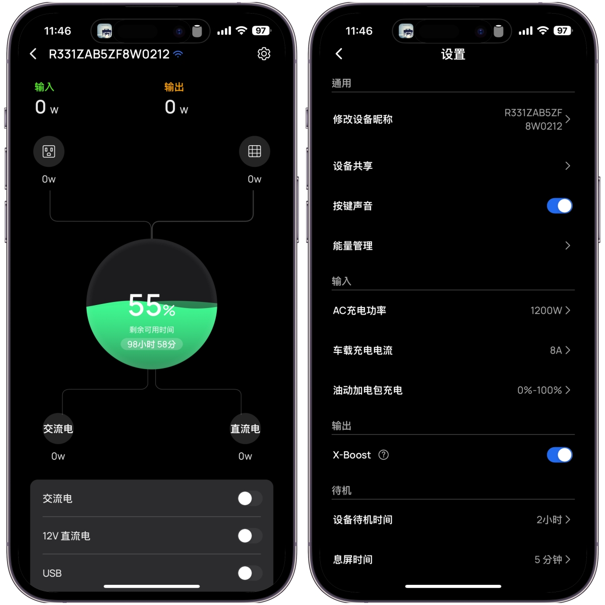 在面板上會顯示目前剩餘電量百分比、照目前的使用方式還能持續使用多久,而右邊則是顯示充電及輸出的功率。