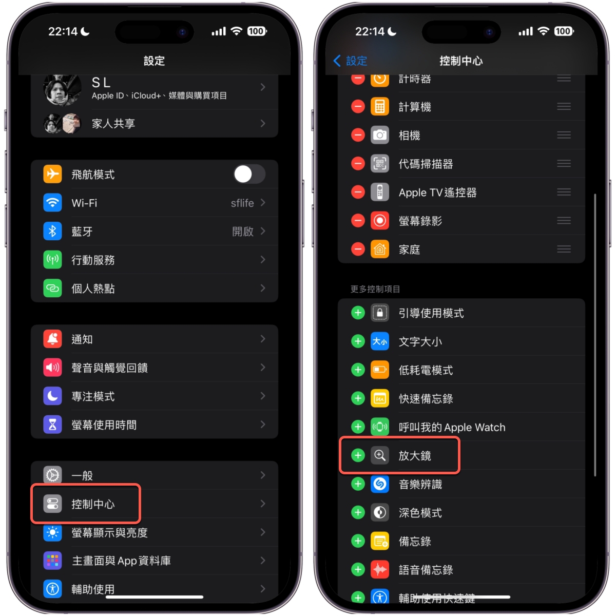 首先,我們要用放大鏡有二個方法,一個是直接在手機裡搜尋放大鏡,不過這每次都要去搜我覺得不方便,所以教大家把它放在控制中心會好一點,進入設定 > 找到控制中心,然後在裡面就可以看到放大鏡,將它加上去。