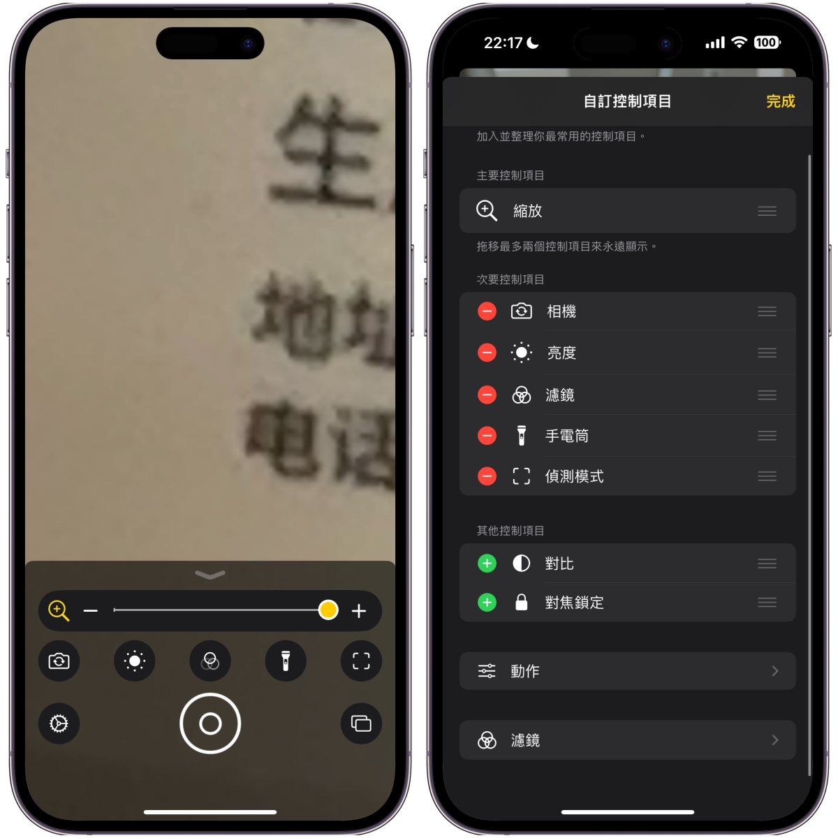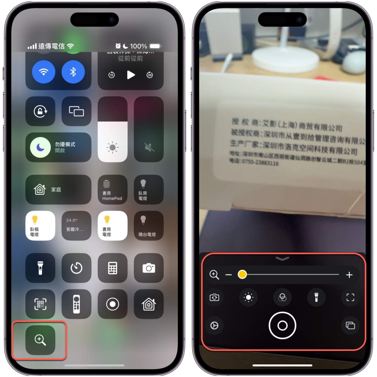 然後右上角往下拉出控制中心,在下方就會看到放大鏡囉,打開後就能使用,看起來很像相機 App,但不同的是,他是直接在這裡拉大倍數去查看,當然,放的愈大,手就要拿的愈穩,其實畫質不會像我截圖那麼爛,因為我手晃了。