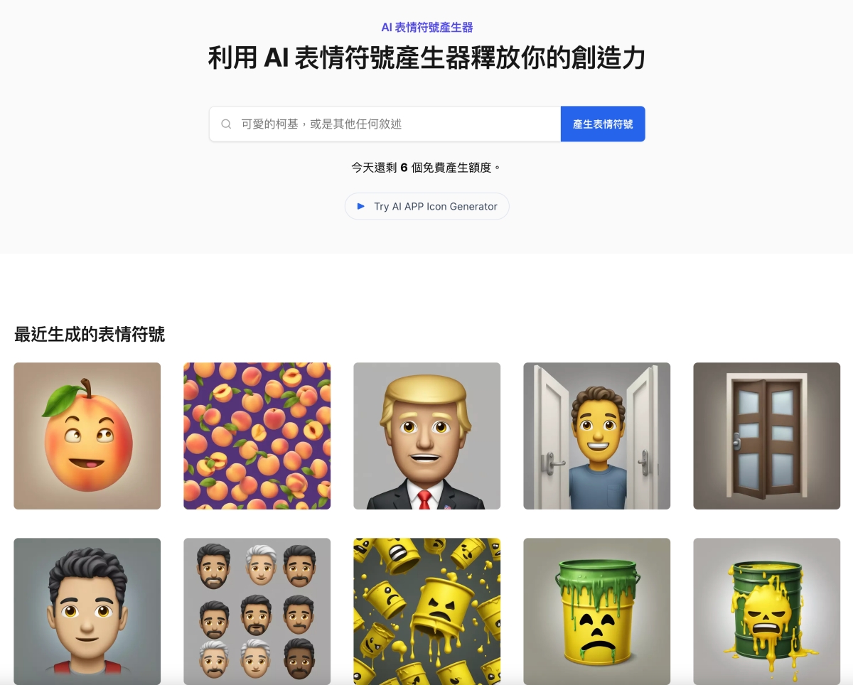 網站:https://aiemojigenerator.org/zh-TW/不需要註冊及登入,每天都可以有六個使用額度,直接輸入描述即可。