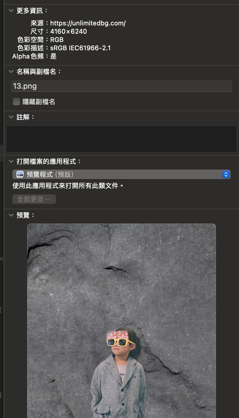 比如我簡單先拉個我兒的照片,去的真的蠻不錯的,其實我試了好幾張,都去背的很好,左上角還可以再編輯去背的區域,或是替換背景,如果想直接下載為 PNG,左下角就能直接按 Download HD。