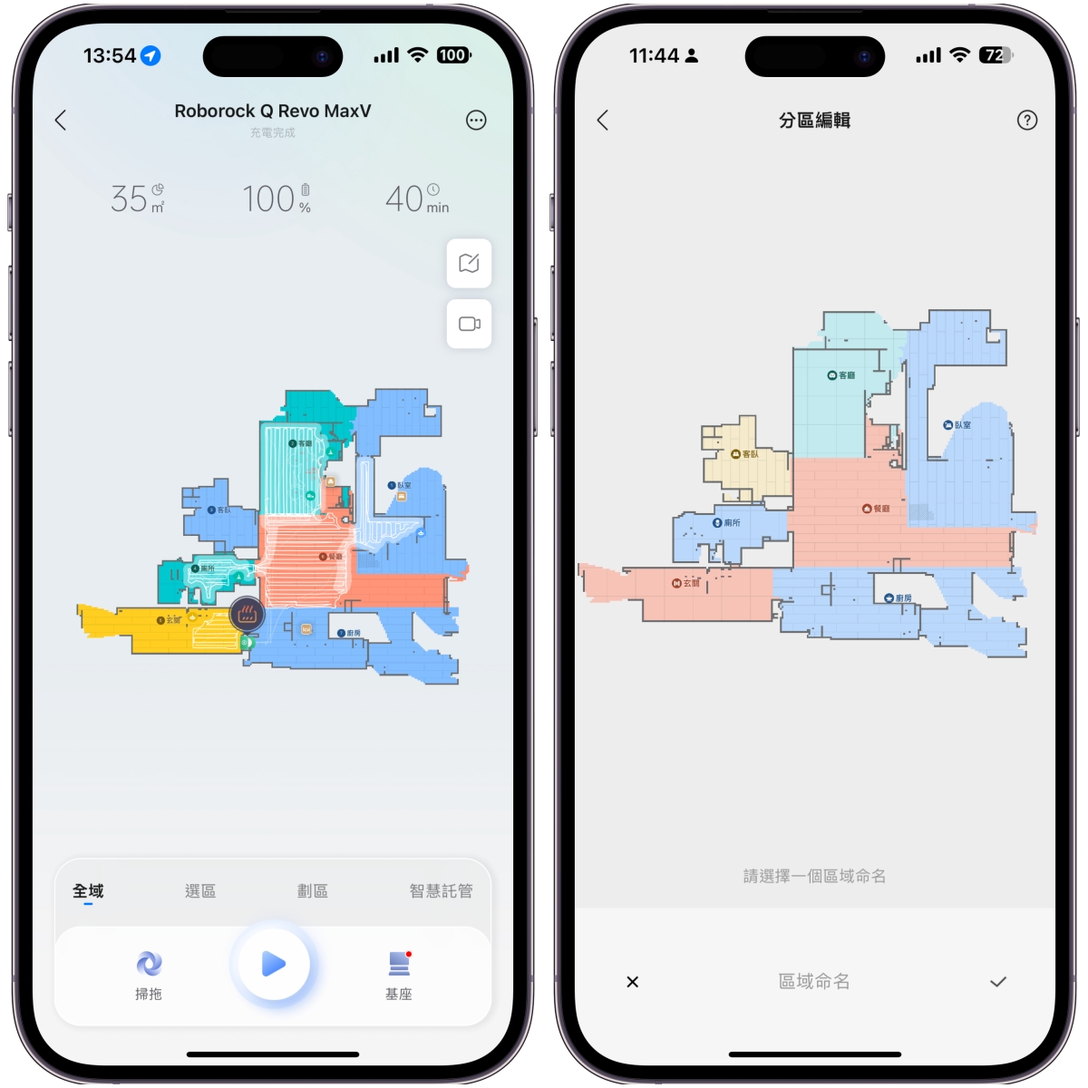 設定的部份,直接透過 Roborock 官方 App 連線設定即可,整個過程大概 1 分鐘可以搞定,第一次使用建議直接就先開跑建立地圖,然後先做好分區編輯,這分區做好不僅之後使用方便,語音控制時就更好用了。