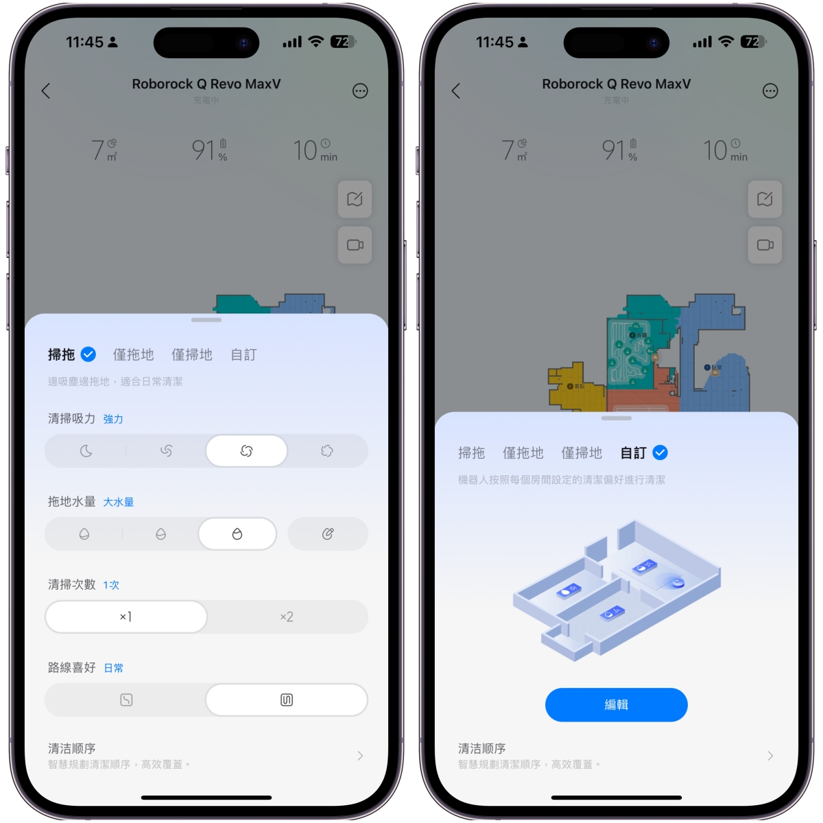 在掃拖設定中,除了設定水量、吸力、次數外,還可以設定清潔順序,我會建議可以由外而內,不要讓掃地機器人會反覆經過掃過的地方,這樣是最乾淨的。